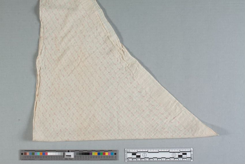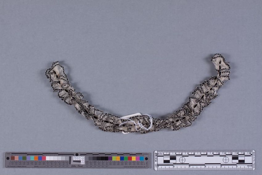 White linen chemisette with lace trim collar, knife pleating along opening edge, two covered buttons, and a ribbon tie in the back.