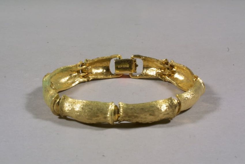 This textured gold plated metal bracelet features six shaped rectangular links attached to one another with small, flexible hinges. The bracelet closes with a flip bar clasp marked with the maker's name.
