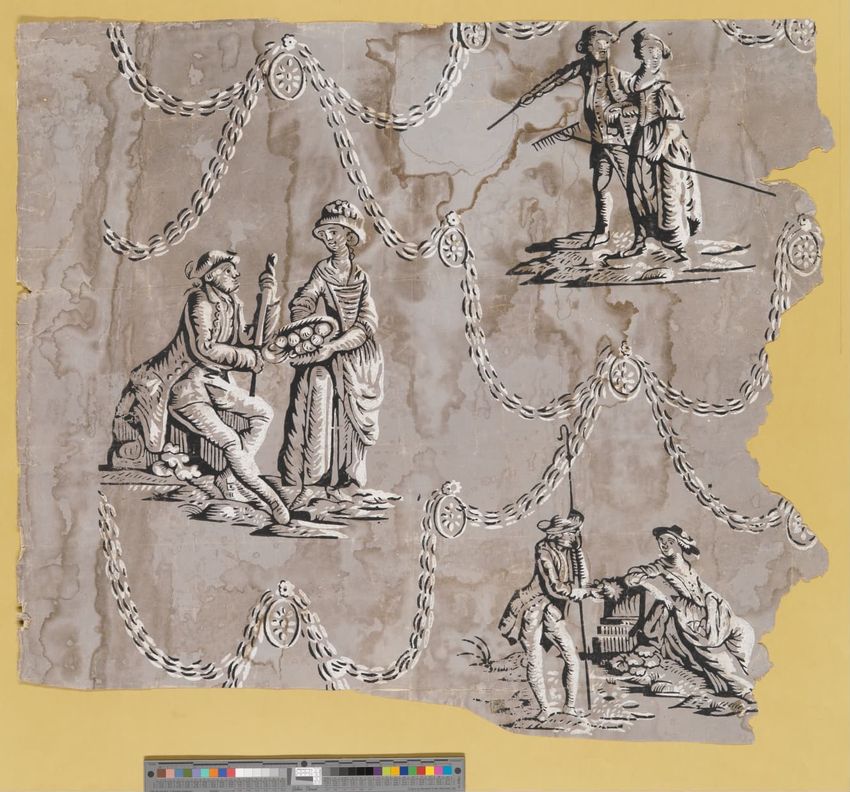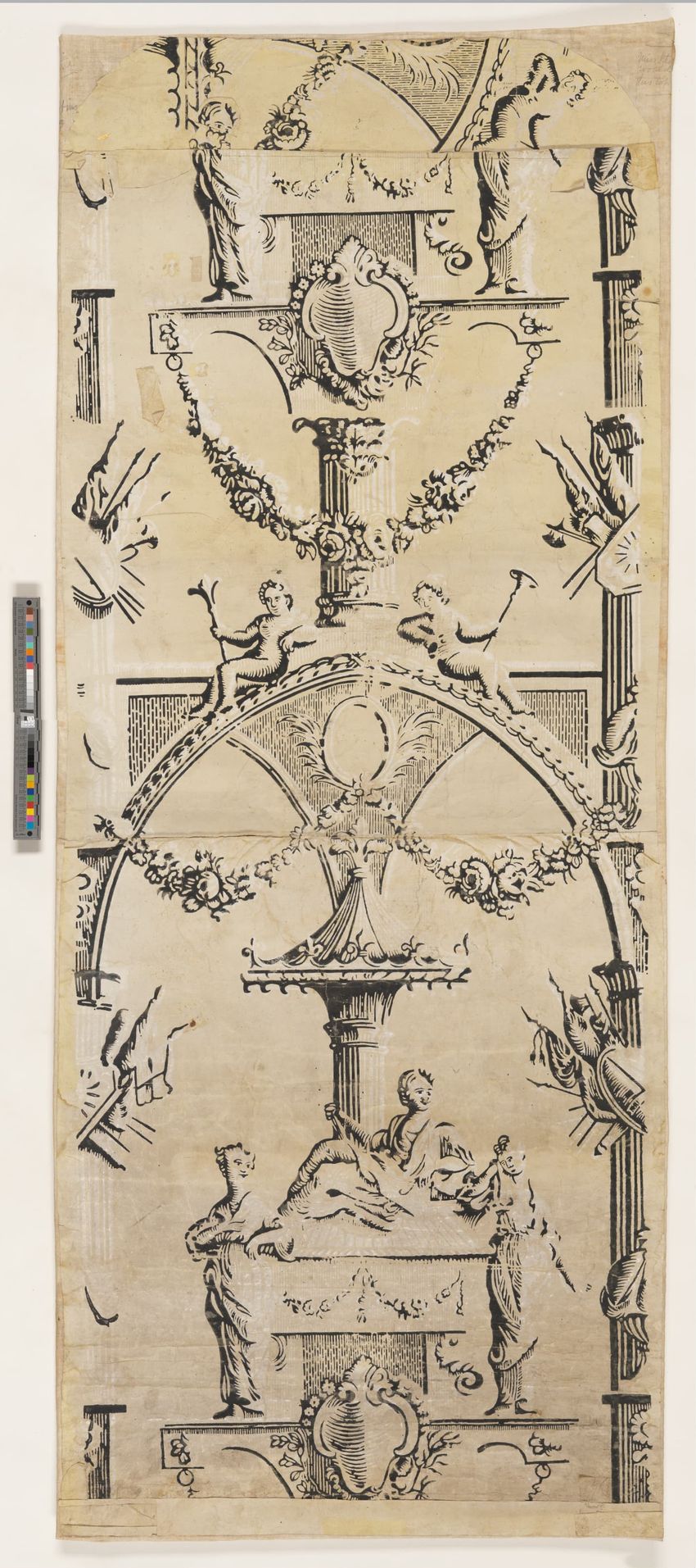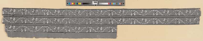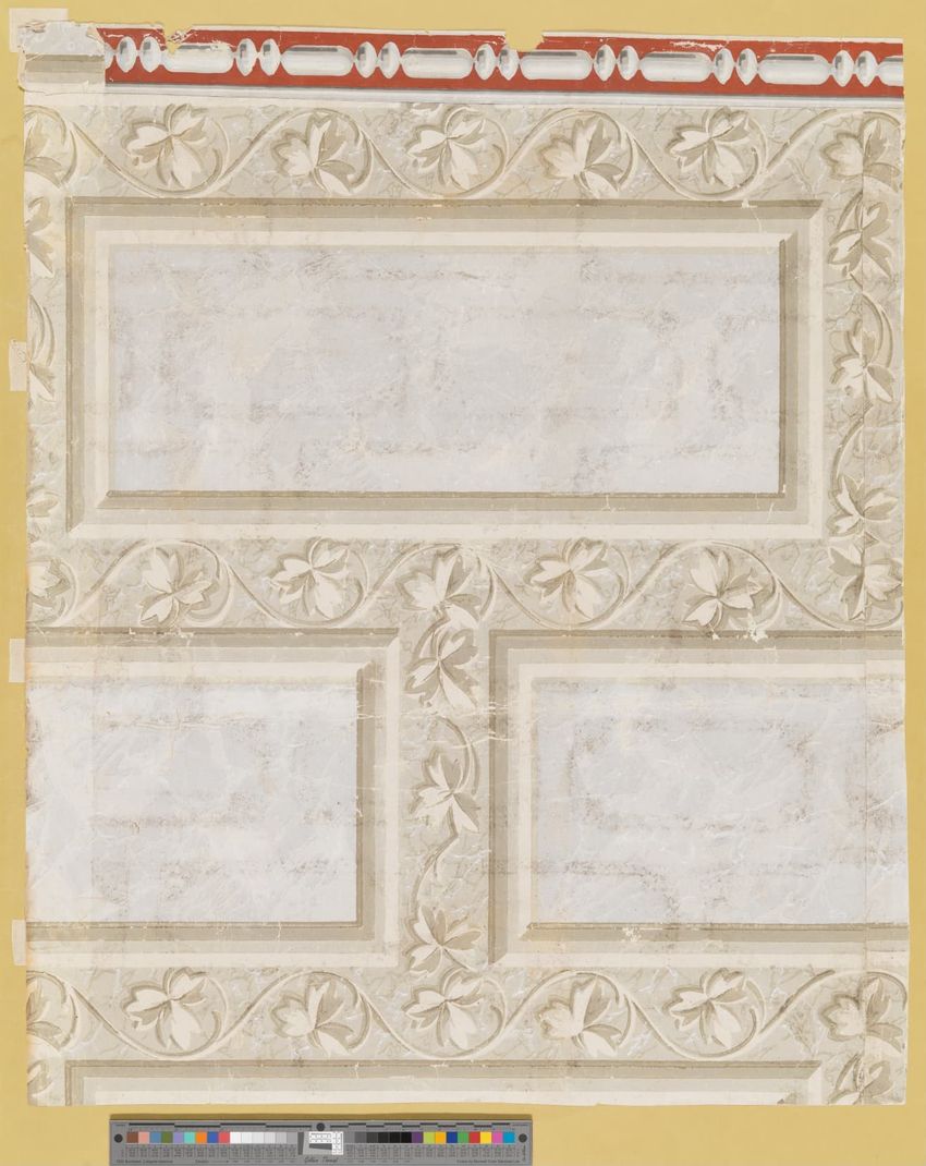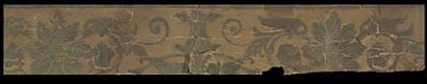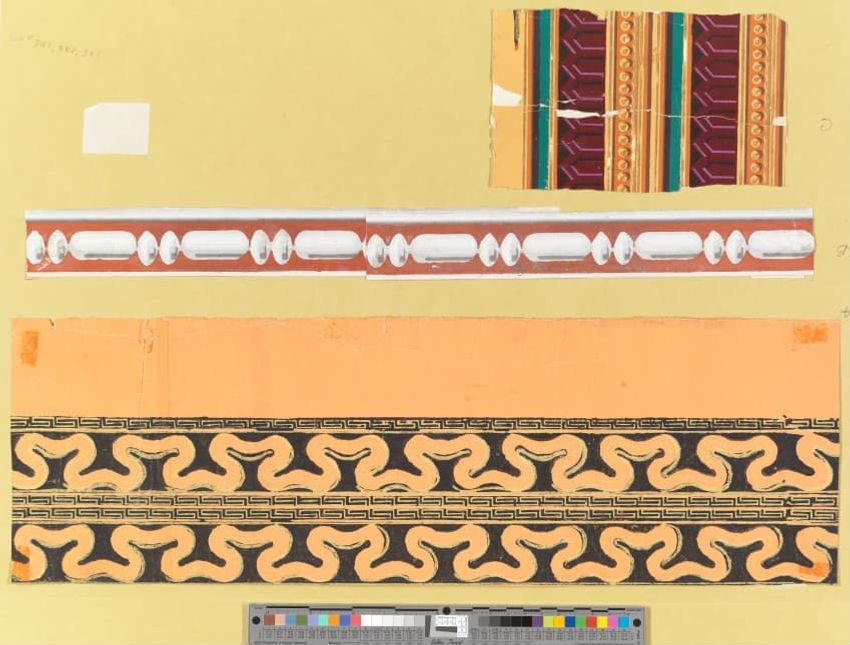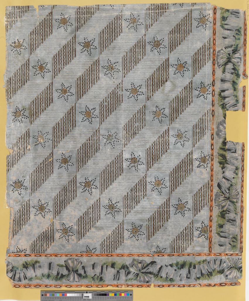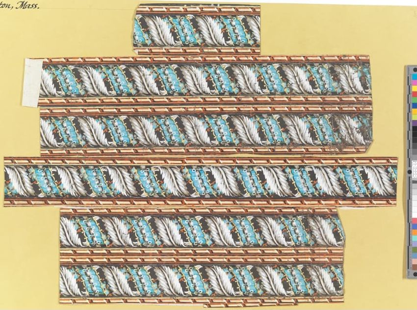 Unused wallpaper border sample. Border has ribbon moulding with bow knots and scalloped edges, with feathers and is framed by reel moulding. Printed in two blues, yellow, orange, black, white, green, grey and taupe on a black ground.