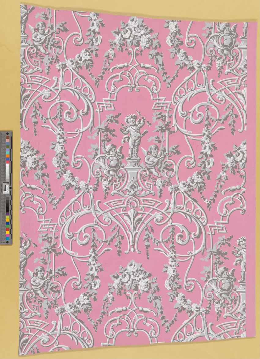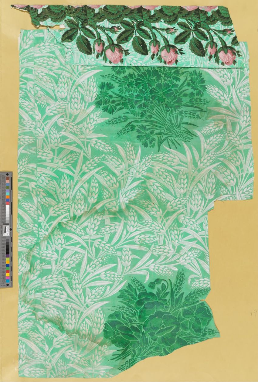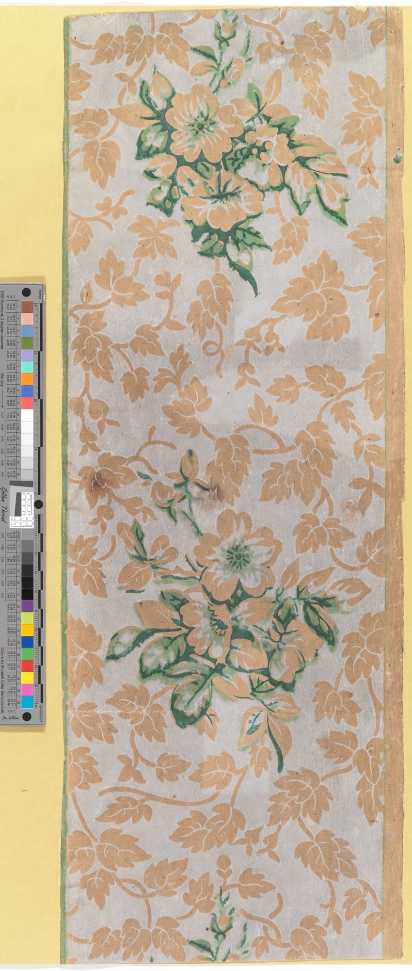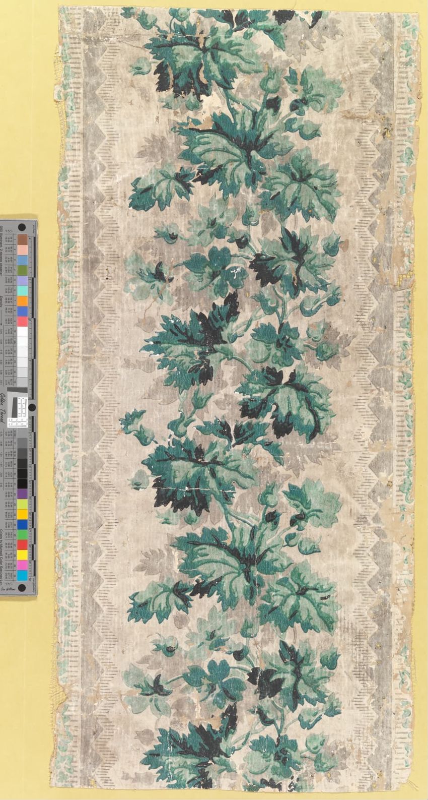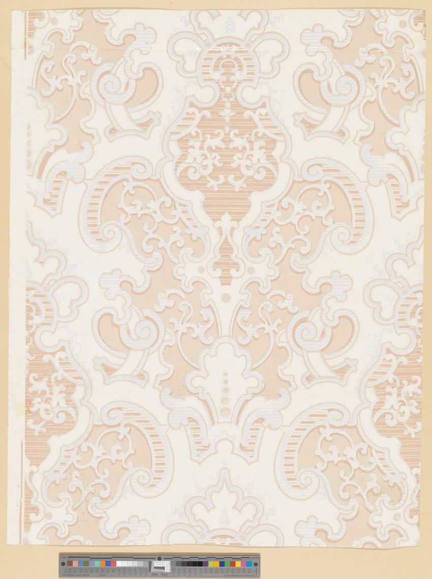 Unused wallpaper border sample. Border has ribbon moulding with bow knots and scalloped edges, with feathers and is framed by reel moulding. Printed in two blues, yellow, orange, black, white, green, grey and taupe on a black ground.