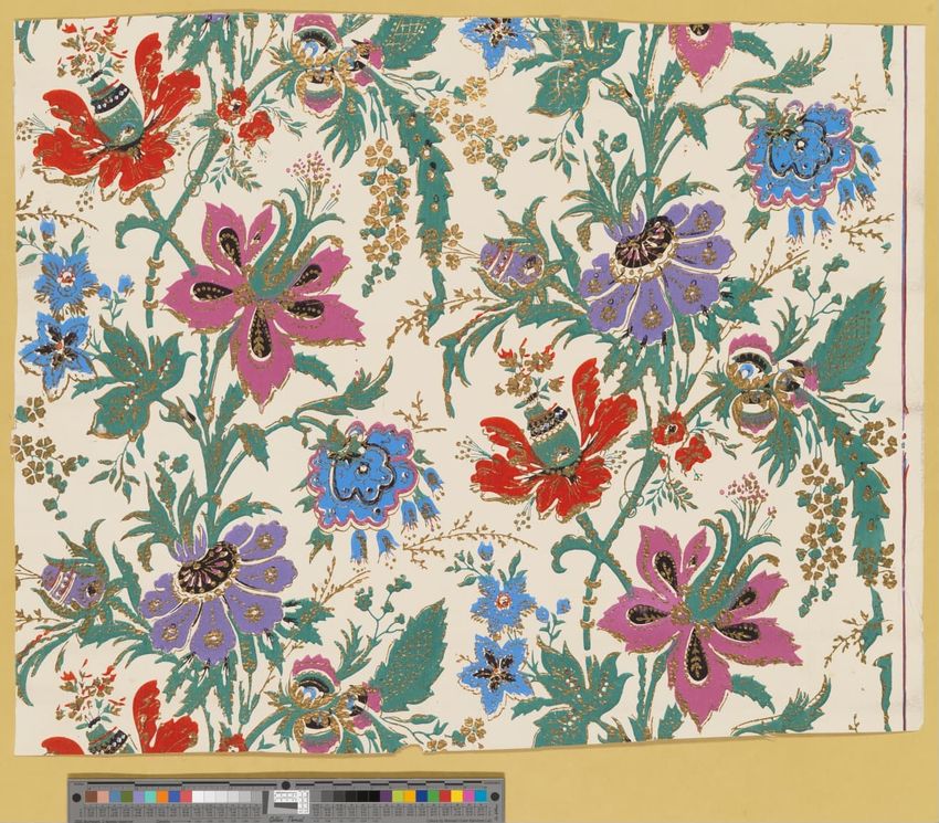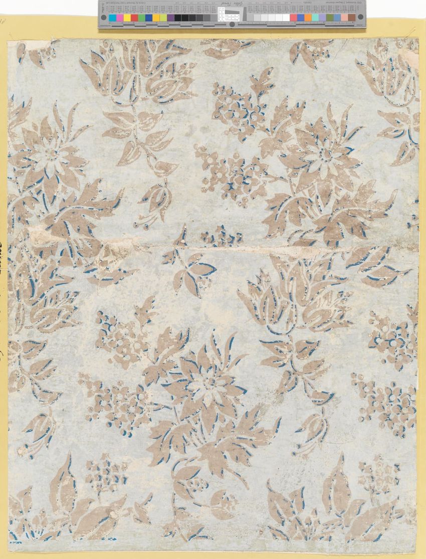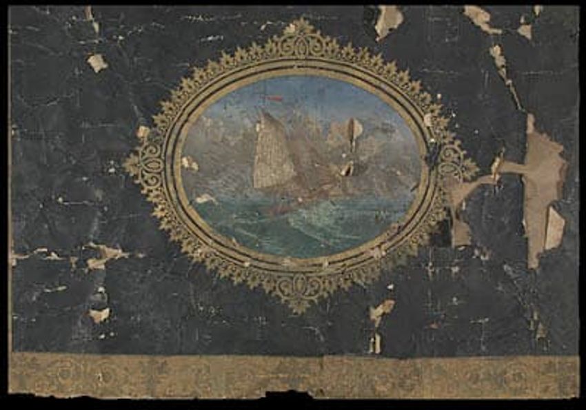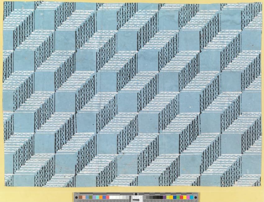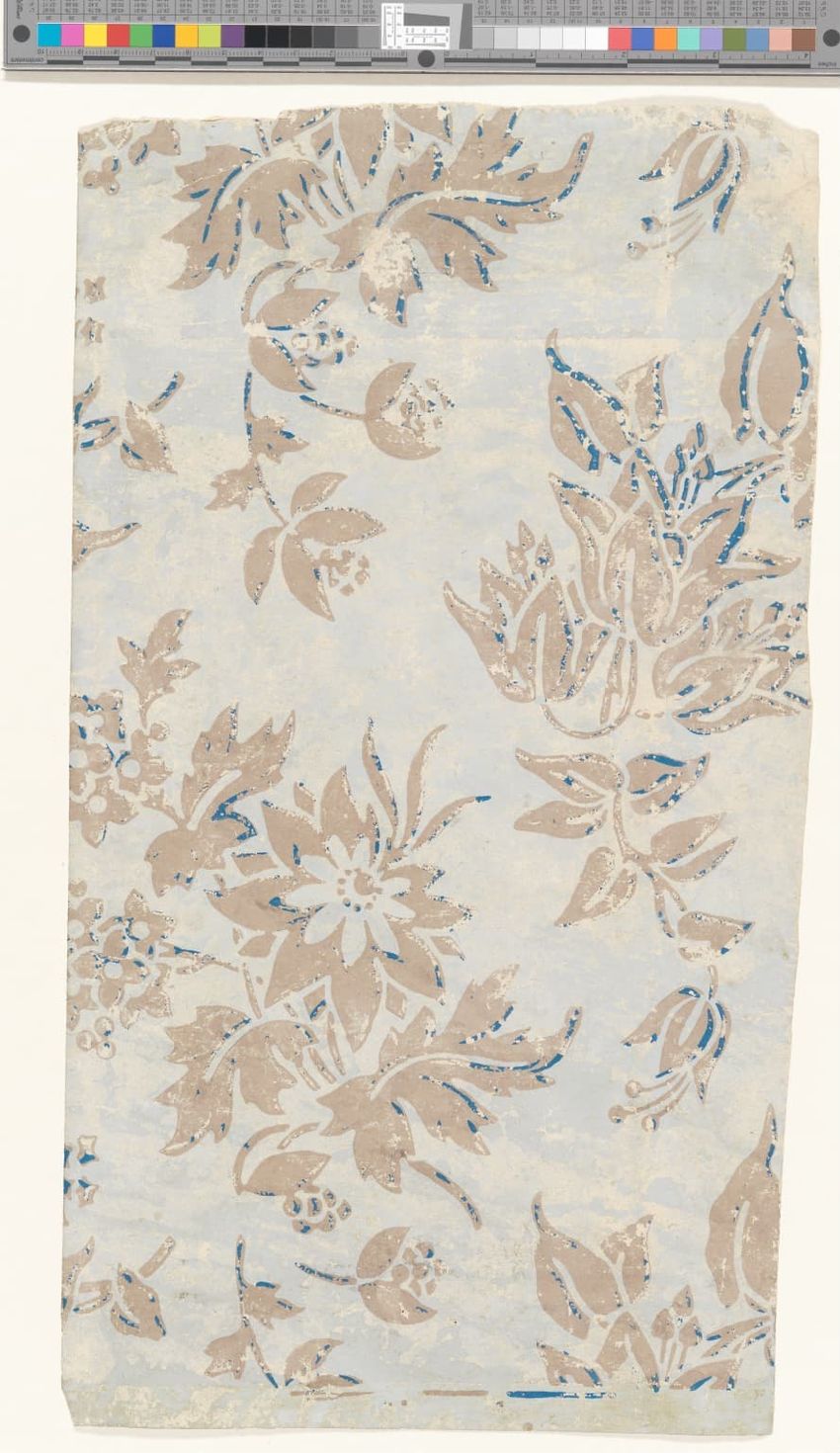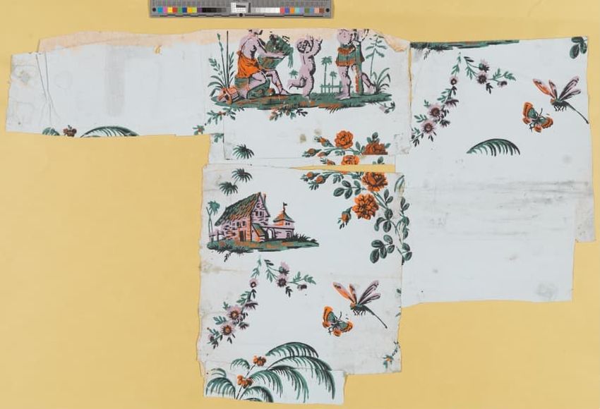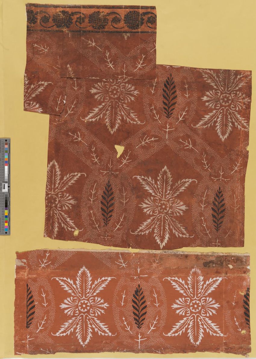 Unused wallpaper border sample. Border has ribbon moulding with bow knots and scalloped edges, with feathers and is framed by reel moulding. Printed in two blues, yellow, orange, black, white, green, grey and taupe on a black ground.