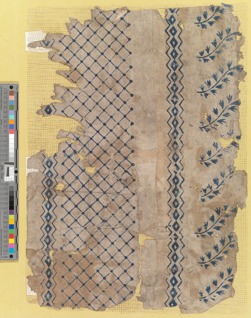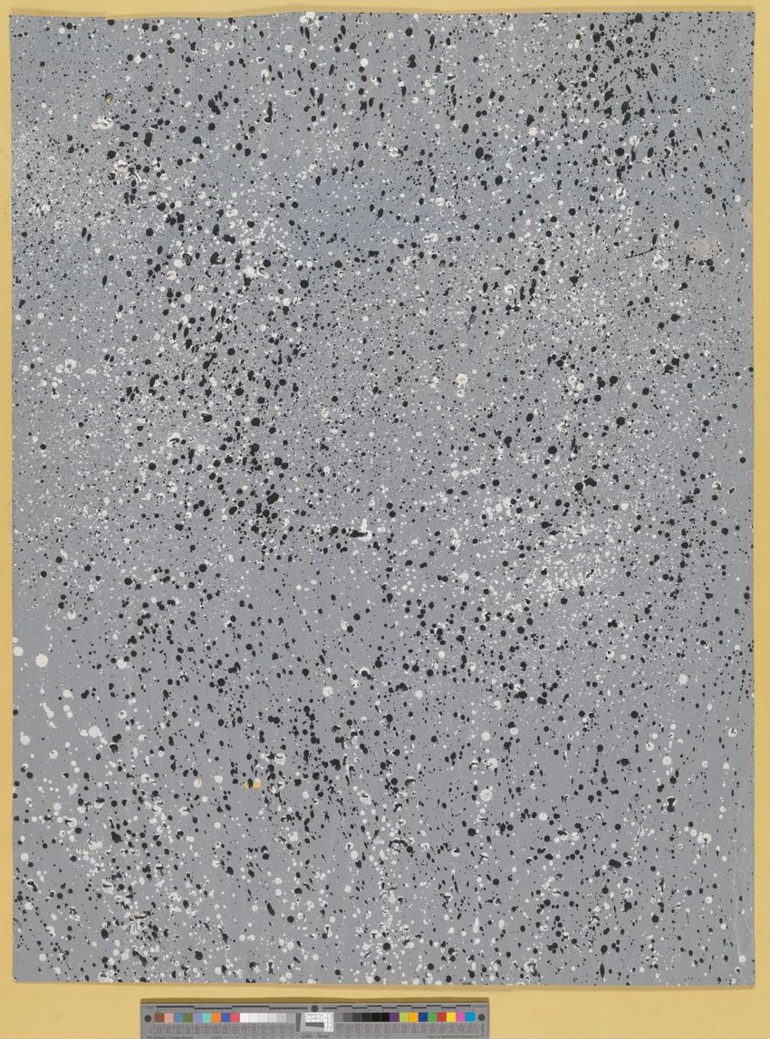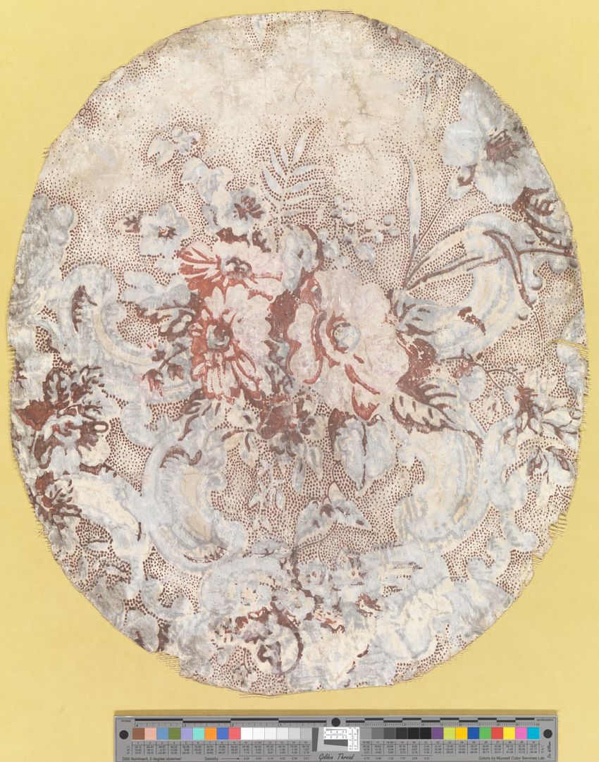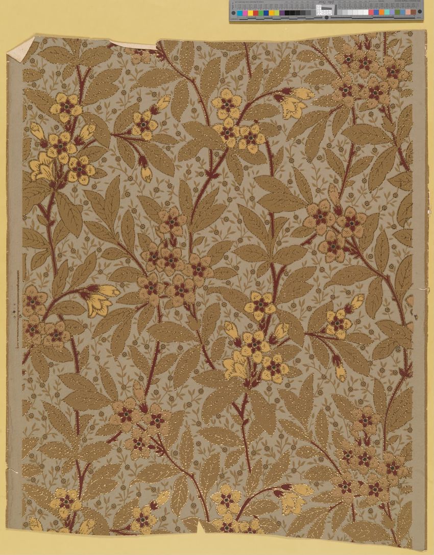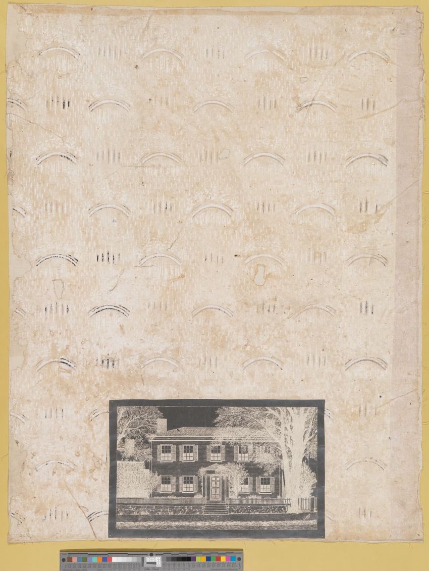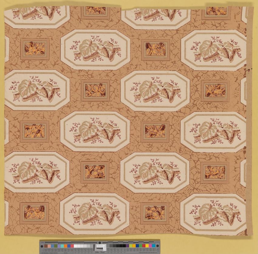 Unused wallpaper border sample. Border has ribbon moulding with bow knots and scalloped edges, with feathers and is framed by reel moulding. Printed in two blues, yellow, orange, black, white, green, grey and taupe on a black ground.