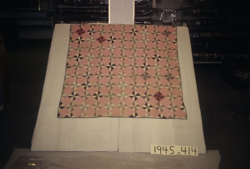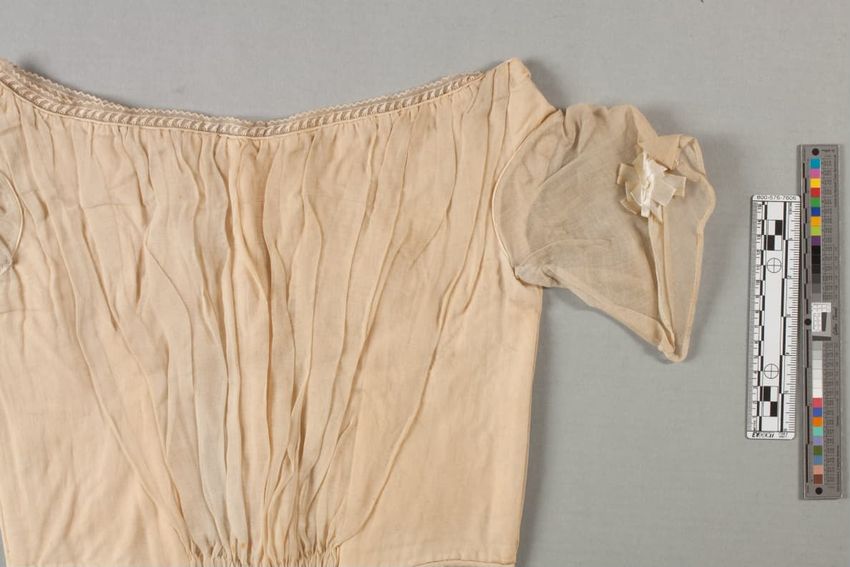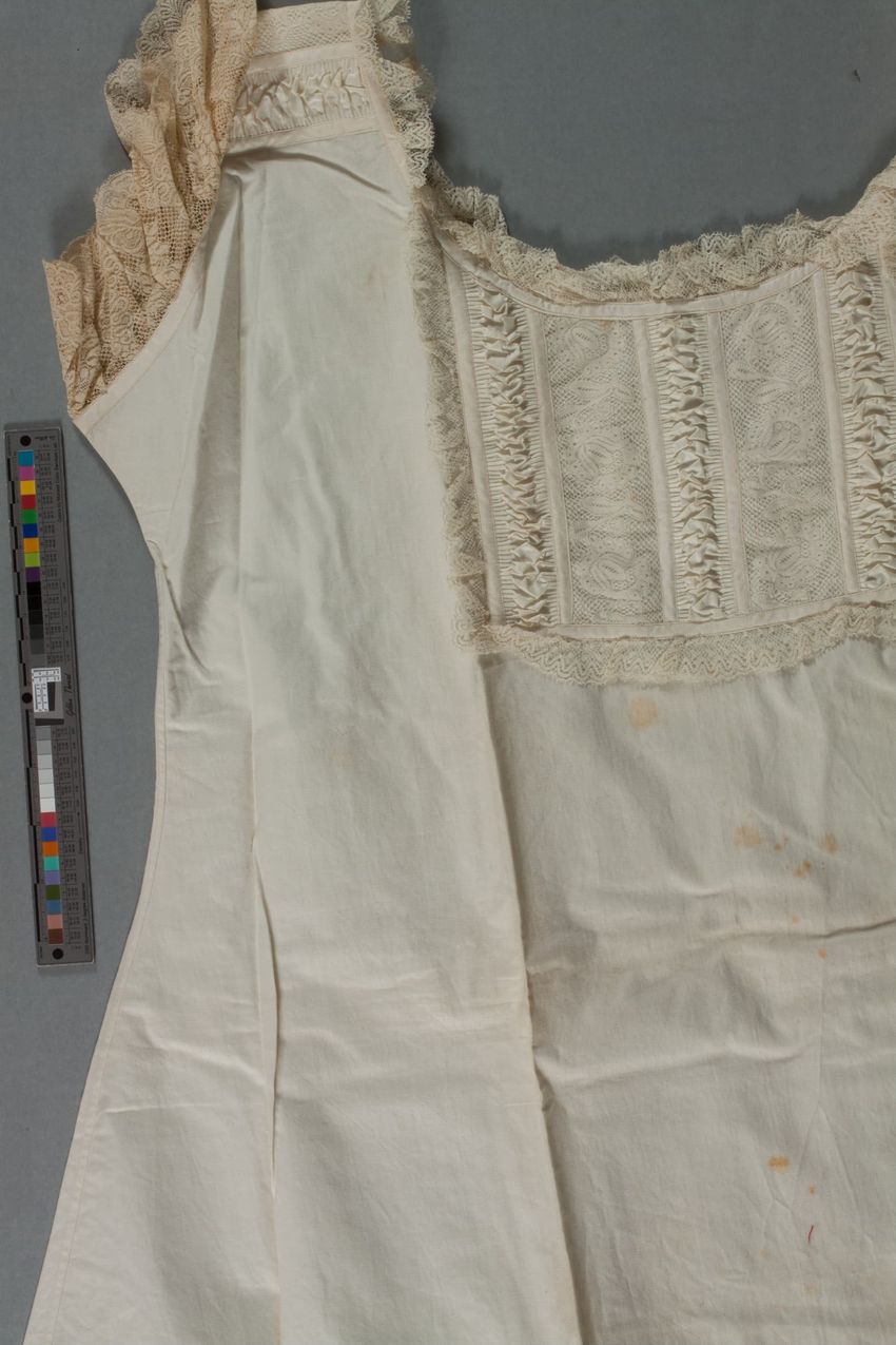 FAN (A): Small ivory sticks and guards, carved in floral spray and gilded; leaf of white lace; gilded washer and ring. BOX (B): Cardboard, hinged, covered in white moire.