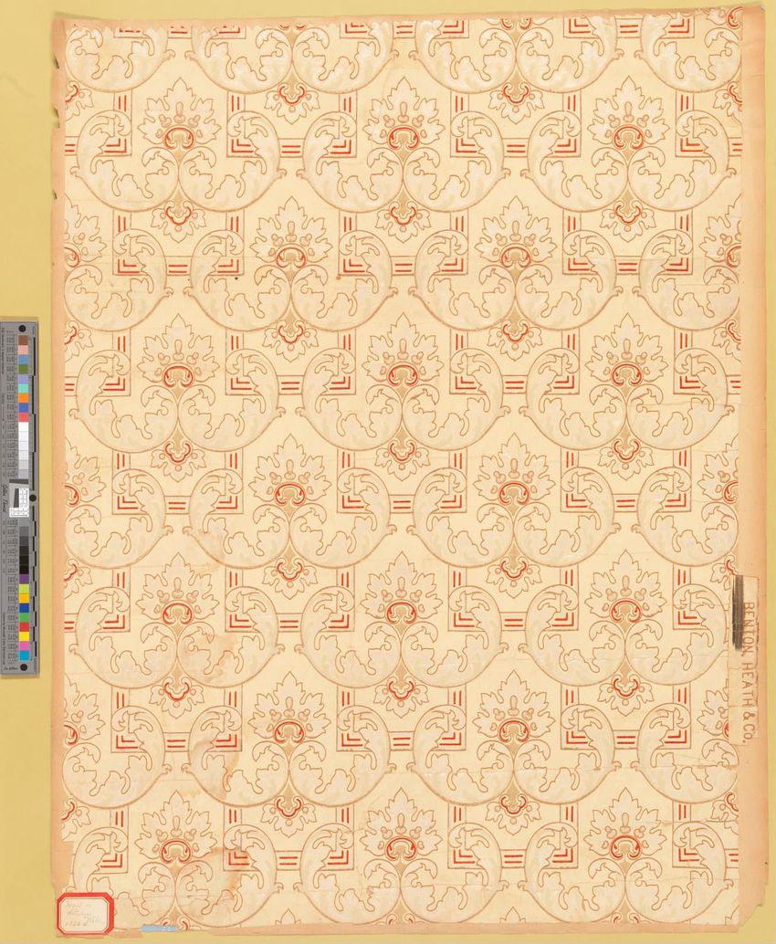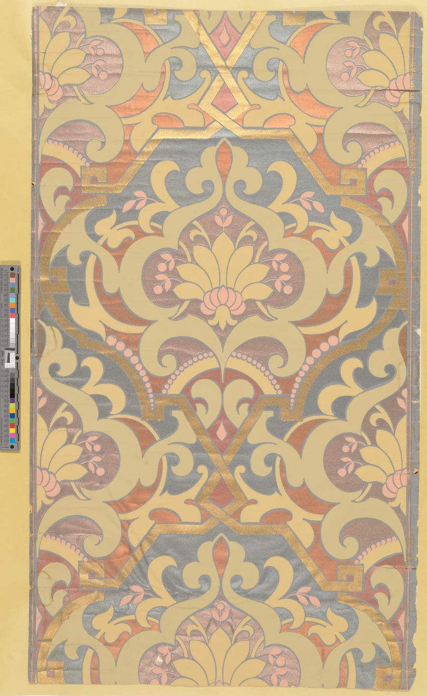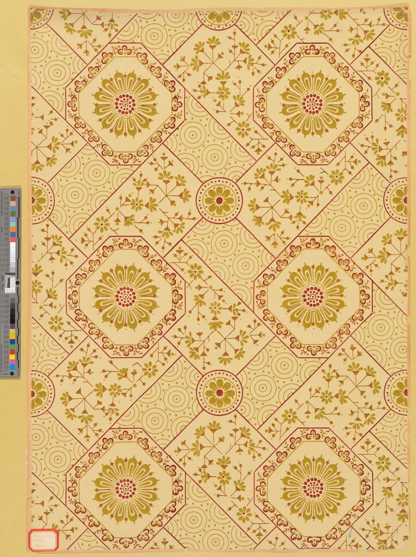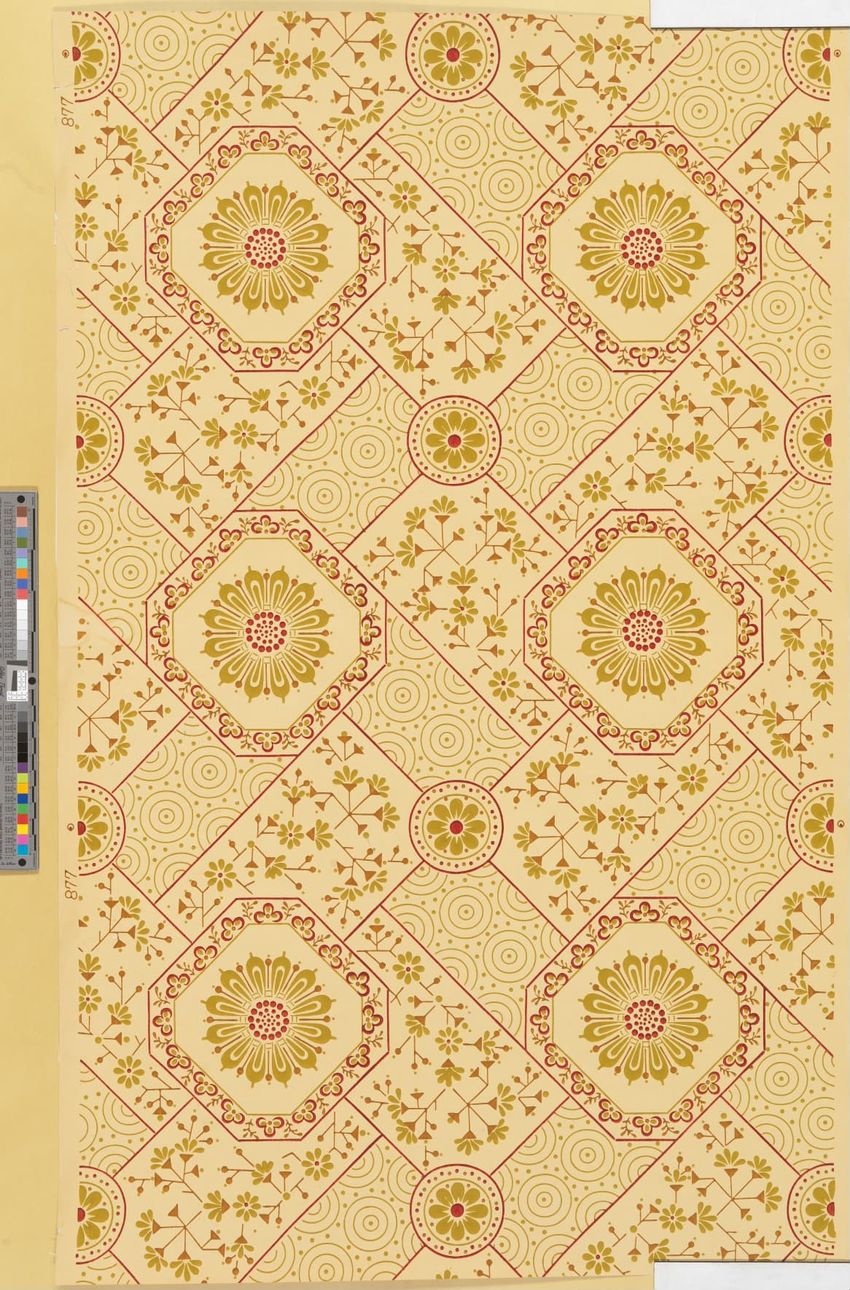 Unused wallpaper sample. Pattern consists of an allover, Anglo-Japanese framework with stylized flowers, concentric circles and rosettes. Printed in a goldish green, brown, red on a tan ground.