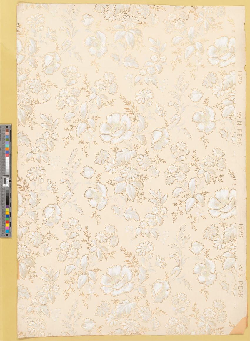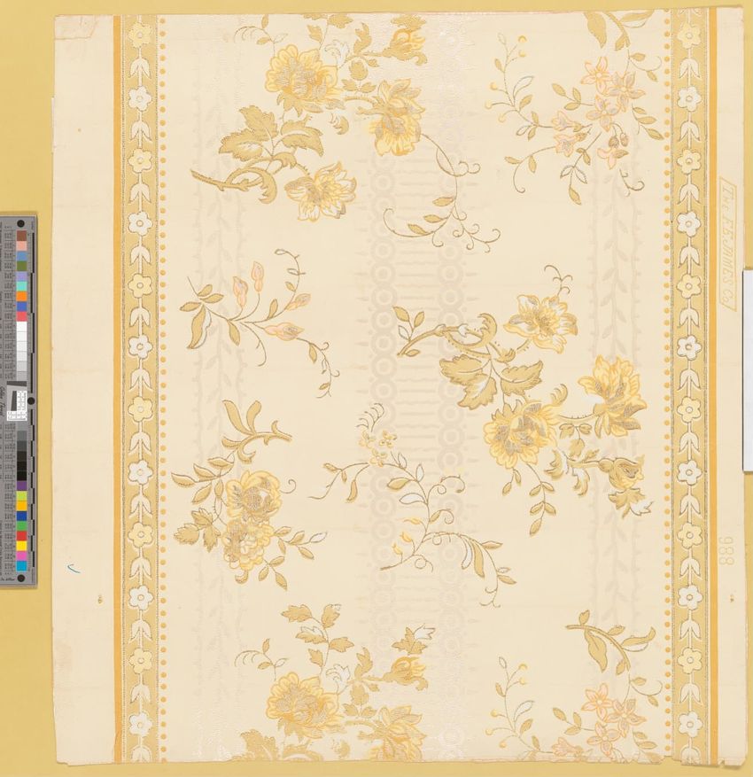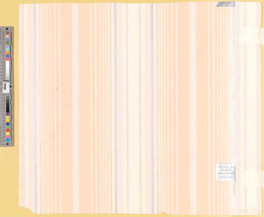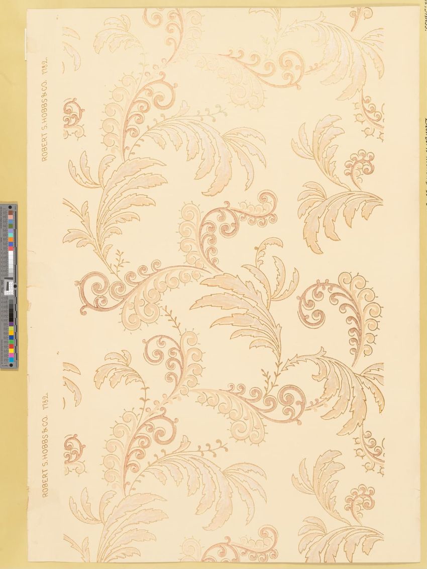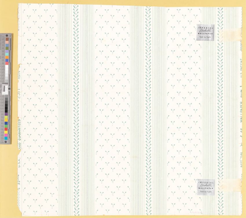 Wallpaper fragment. Foliate and floral scroll pattern printed in gray, overprinted with darker gray stripes. White, polished ground. Straight repeat.