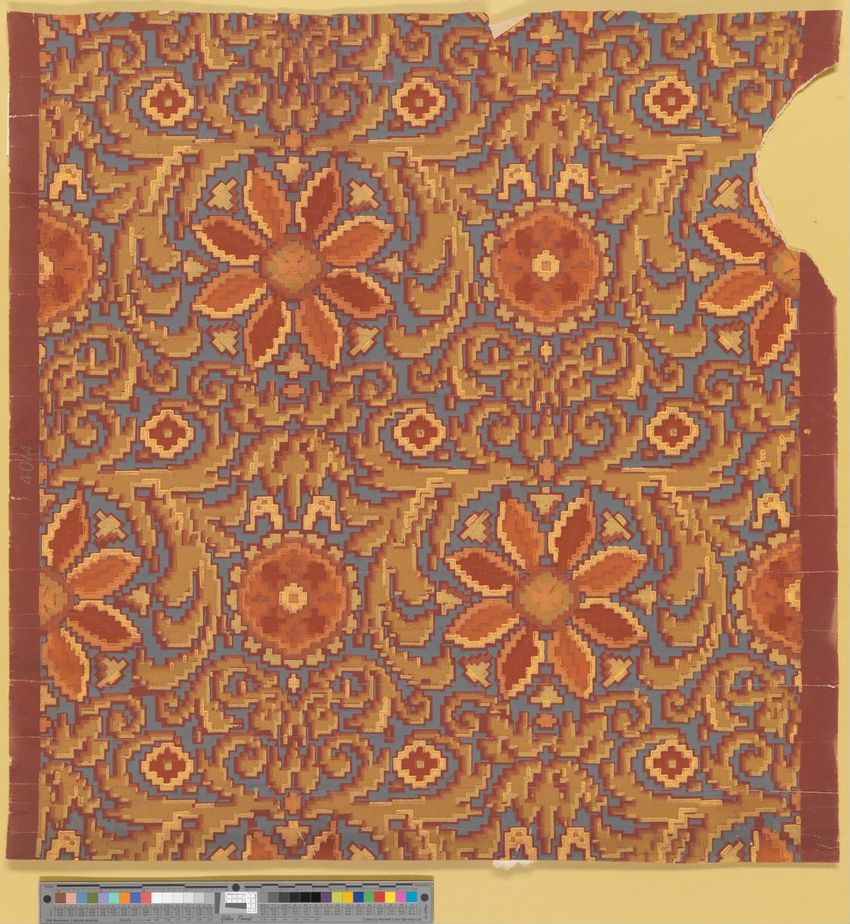 Fragments, Rosettes in green enclosed by yellow wreaths with anthemion design (straight repeat?)