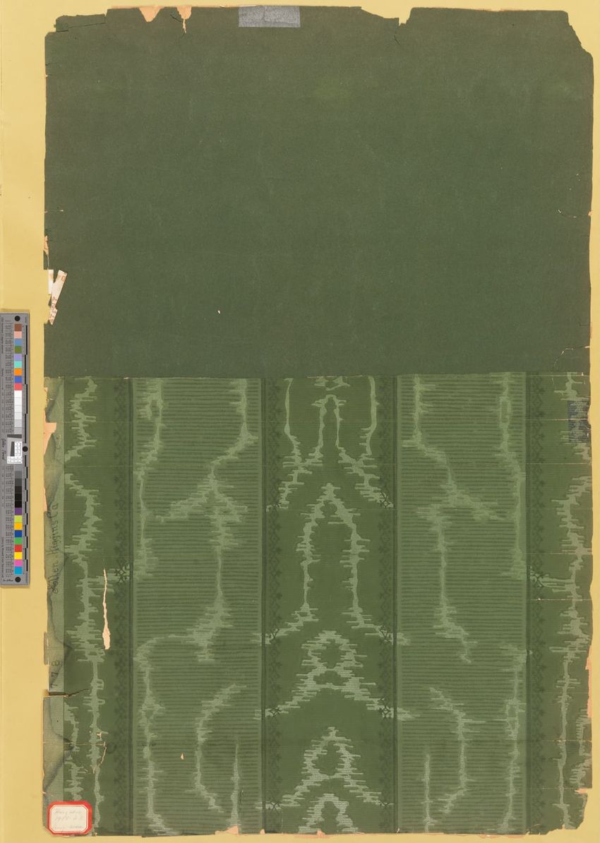 Unused wallpaper sample. Vertical stripe. Broad green stripe bordered by two narrow stripes in same color on green ungrounded pulp paper.