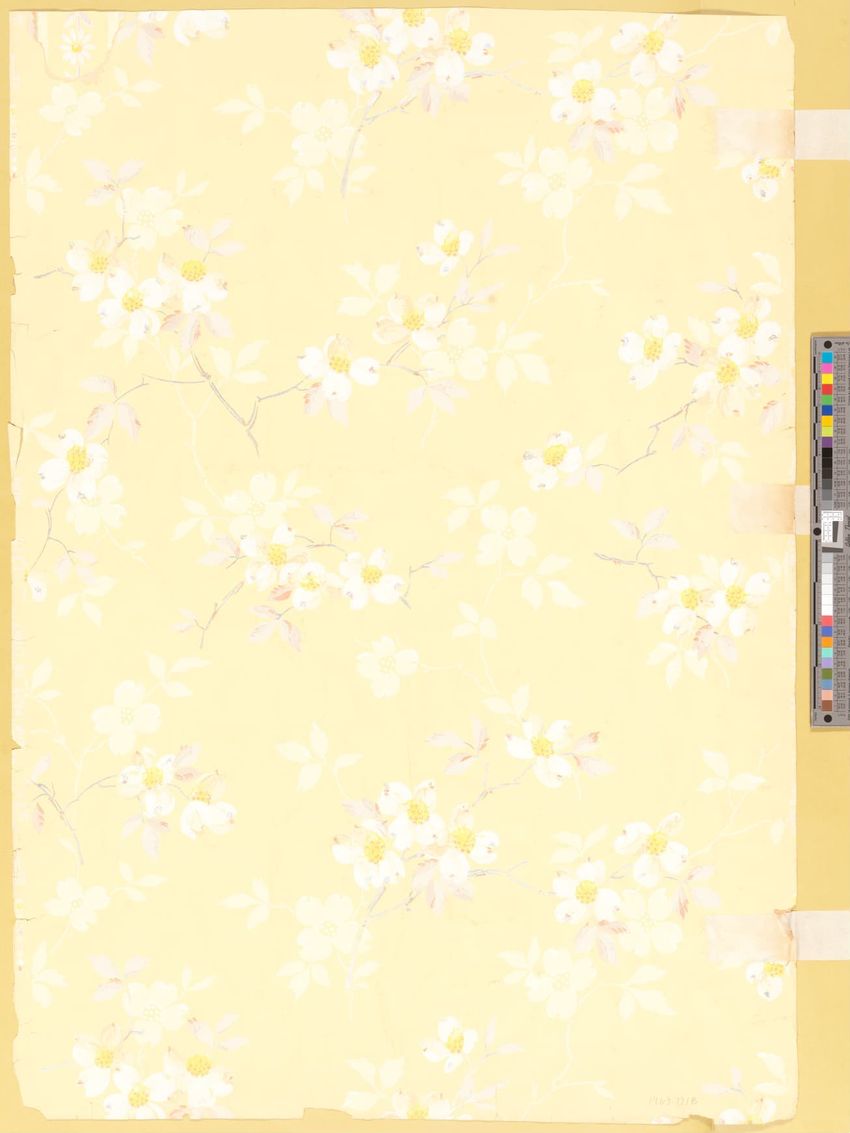 Unused wallpaper sample. Allover pattern of large-scale apple blossoms and boughs. Printed in white, tan, pink, grey and metallic silver on pale yellow-orange ground. Drop repeat.