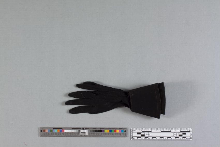 White; low standing collar (four buttonholes for studs along front); front panel, rounded, with machine embroidery of delicate floral garland with small tucks; full sleeves with linen cuffs with topstitching, four buttonholes; rounded cuffs; box pleat below panel to hem. Gathered along yoke at back ...