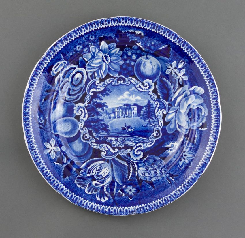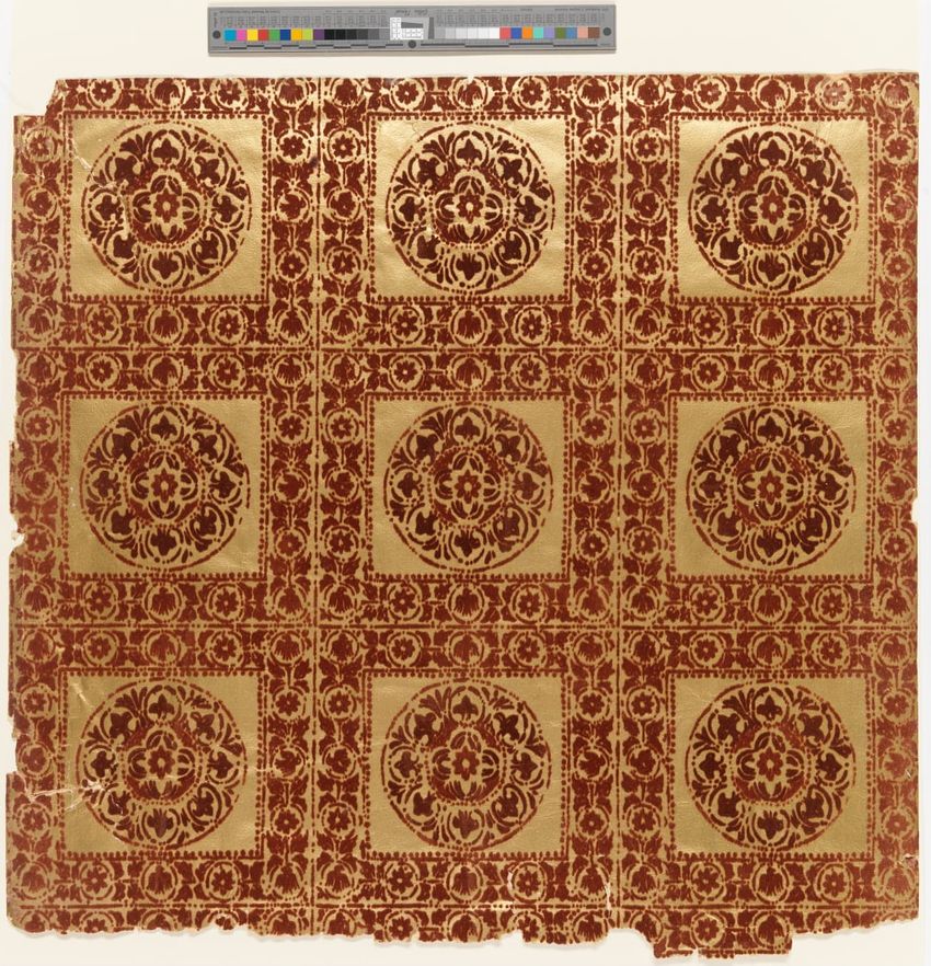 Fragment of Walt Disney cartoon character paper showing Mickey and Minnie Mouse on a picnic with Pluto, Donald Duck with train, Goofy, Pinocchio with Bambi, and two of the seven dwarfs. Light pink (?) ground with pattern printed in blue, pink, yellow, brown, black, red, orange.