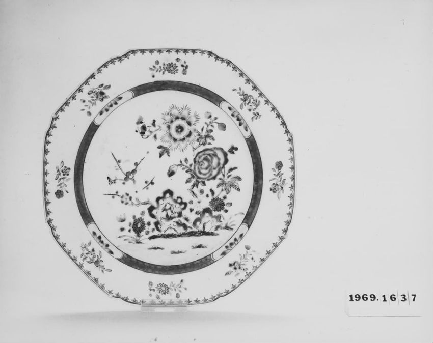 Pk, white, green; oct, shallow well, floral spray, famille rose