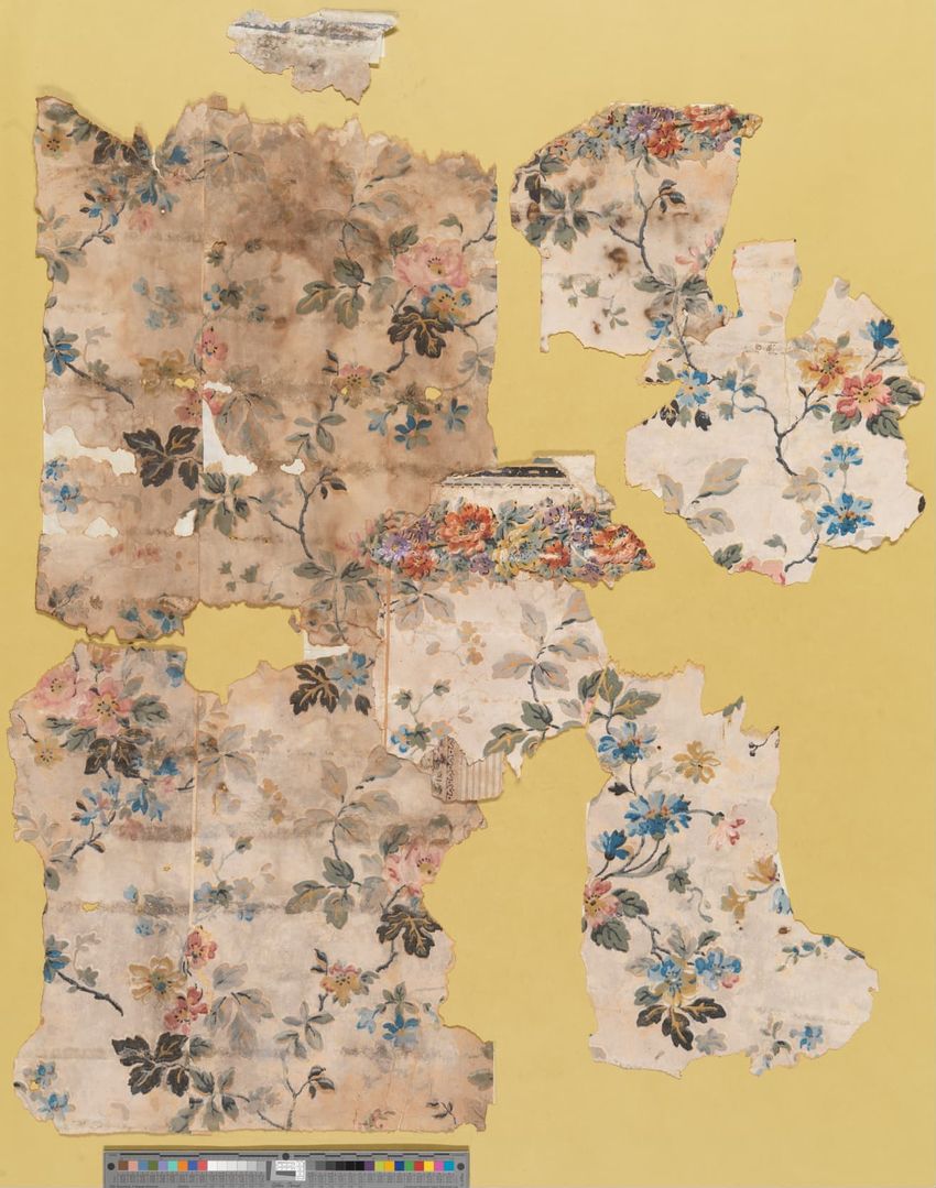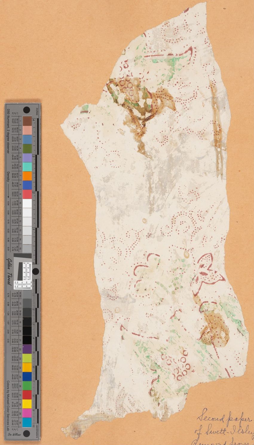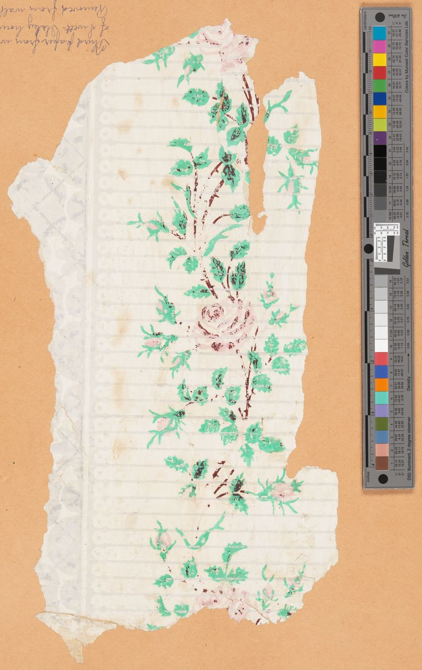 Fragment. Densely arranged floral design below black horizontal lines with reverse printed dots and dashes. Border has been cut along contours of flowers. Printed in red, green, yellow, violet, grey and black.