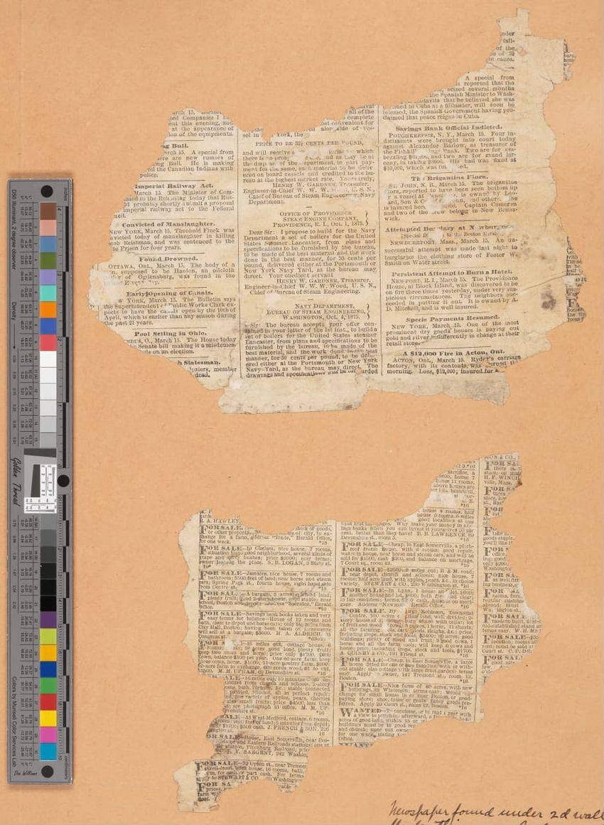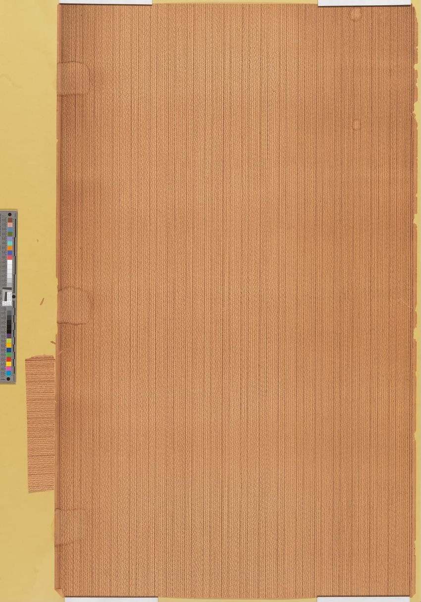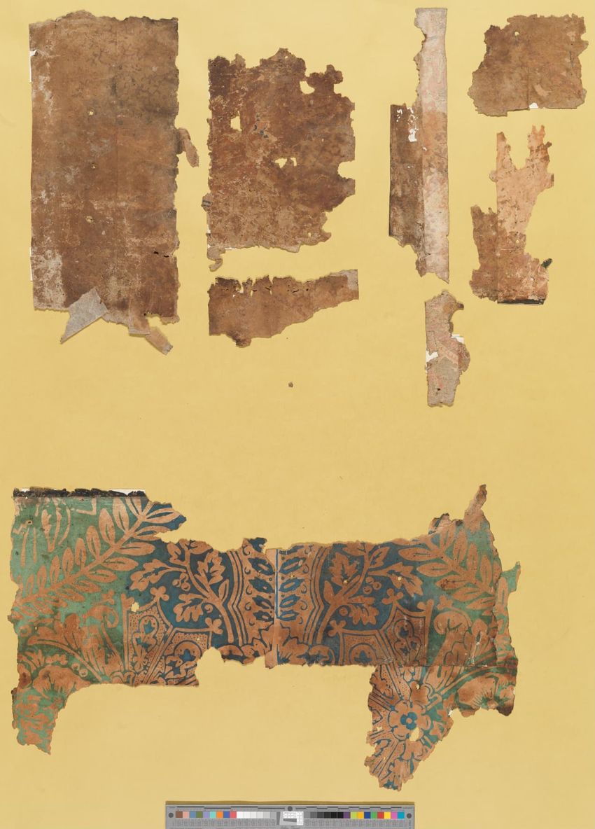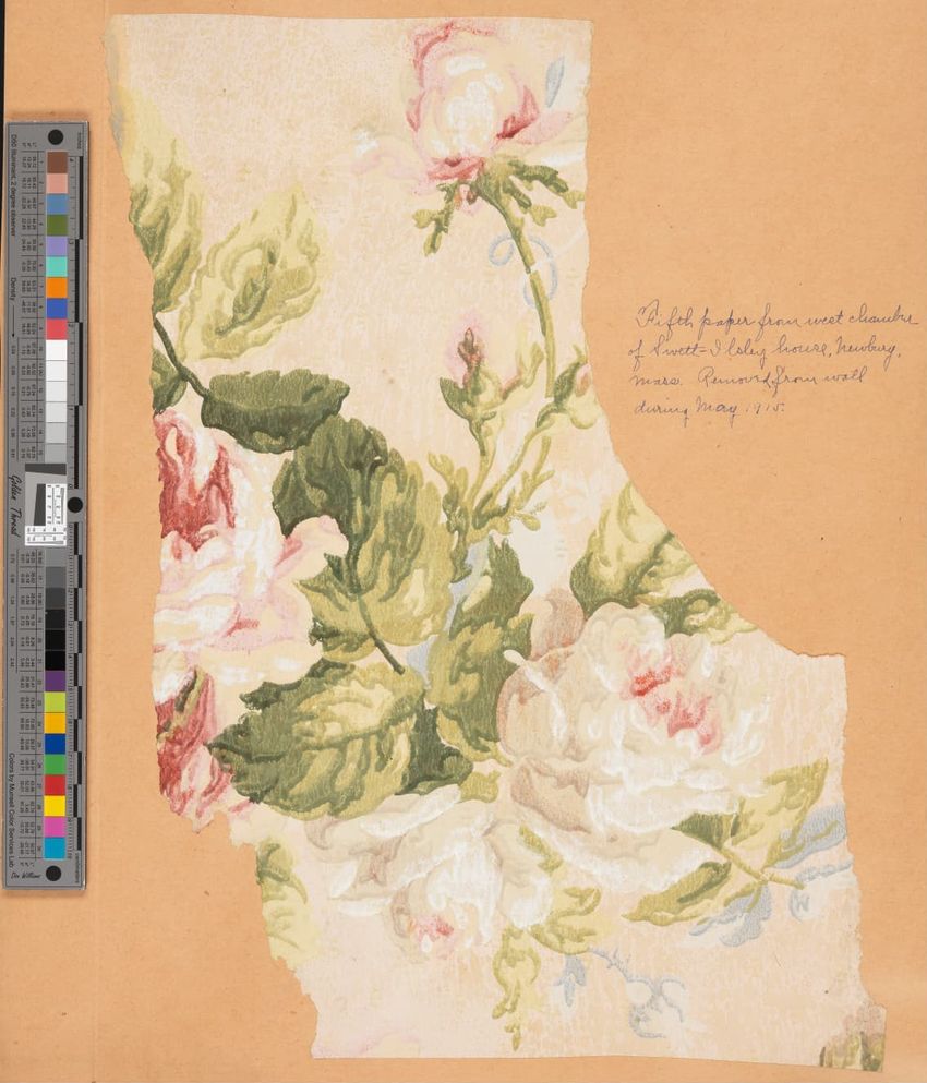 Fragment. Densely arranged floral design below black horizontal lines with reverse printed dots and dashes. Border has been cut along contours of flowers. Printed in red, green, yellow, violet, grey and black.