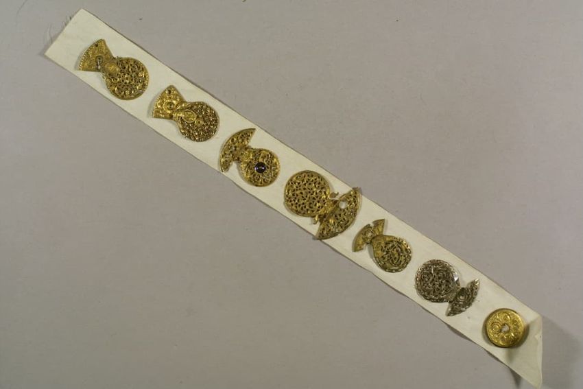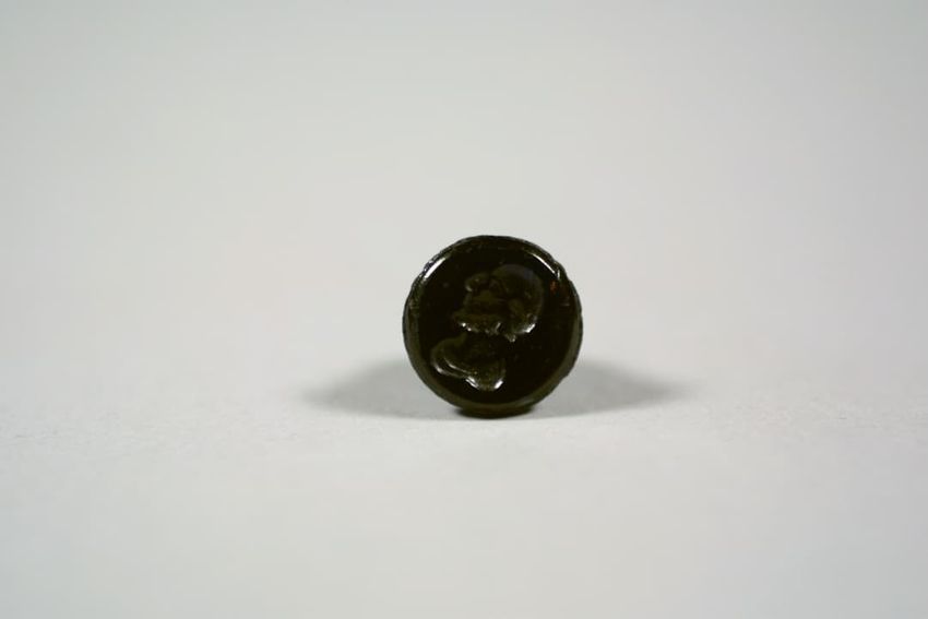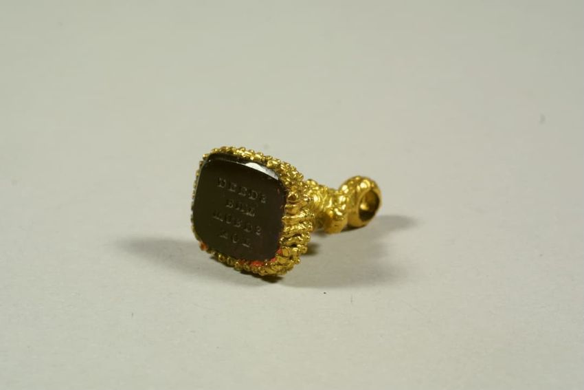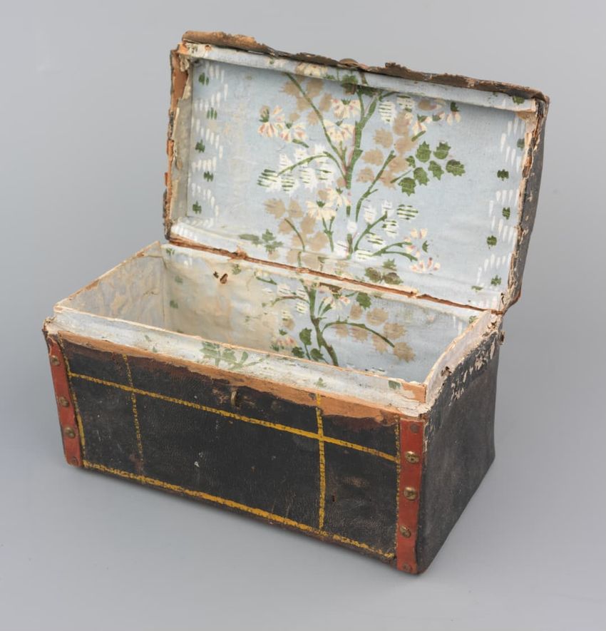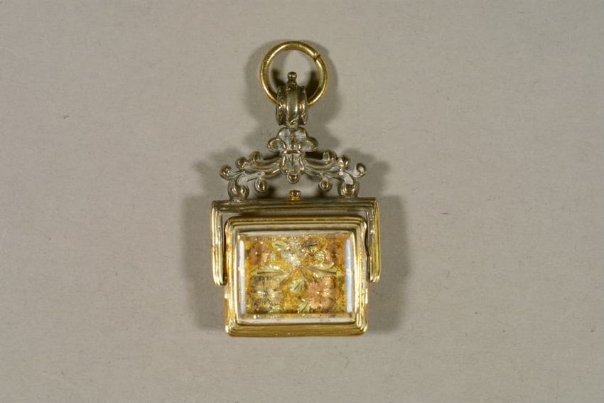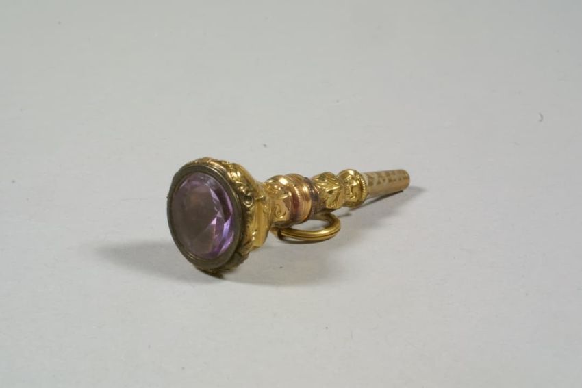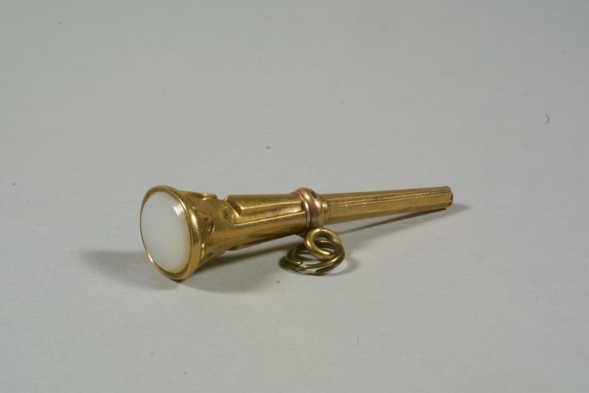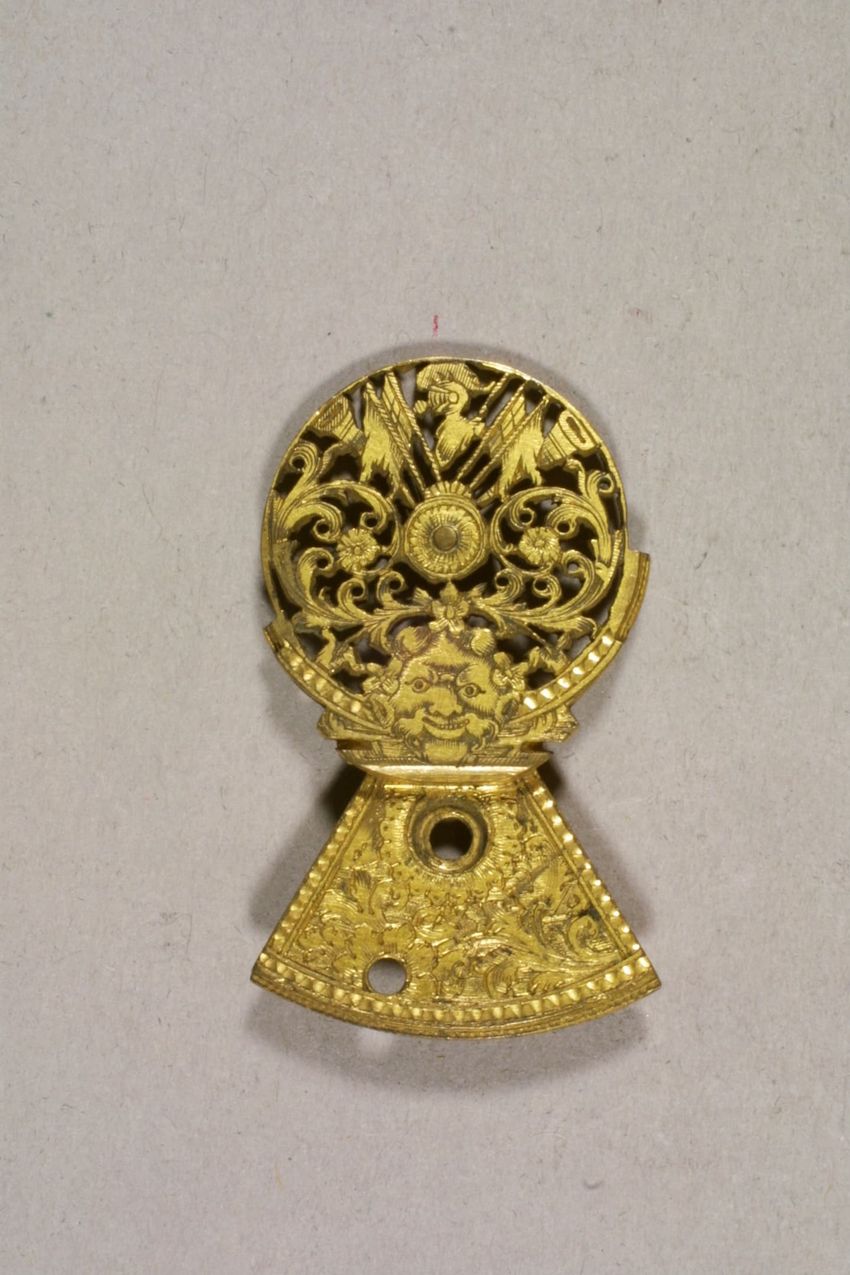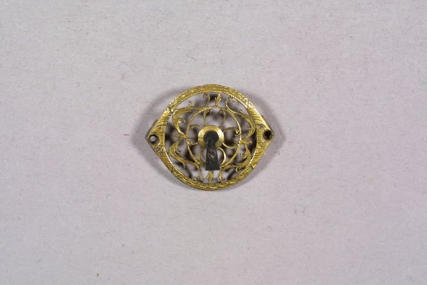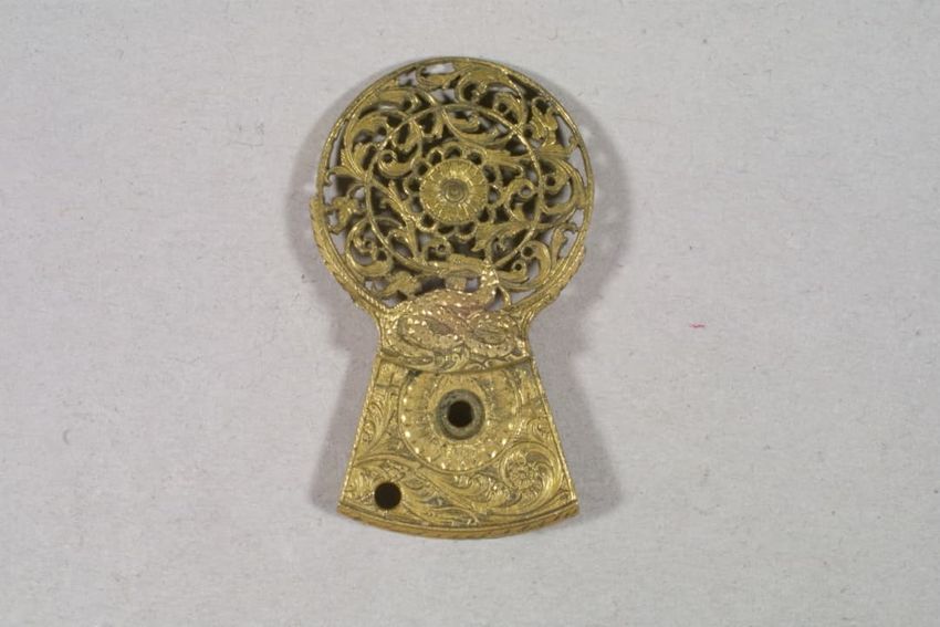 Upright walnut parlor organ, stepped pediment top, front features an applied pierced and carved frieze with small wood shelf below for holding music, slanted cover with two recessed geometric shapes, lid retracts into body, ivory keyboard and panel with eight labeled knobs, applied carved scrolled m...