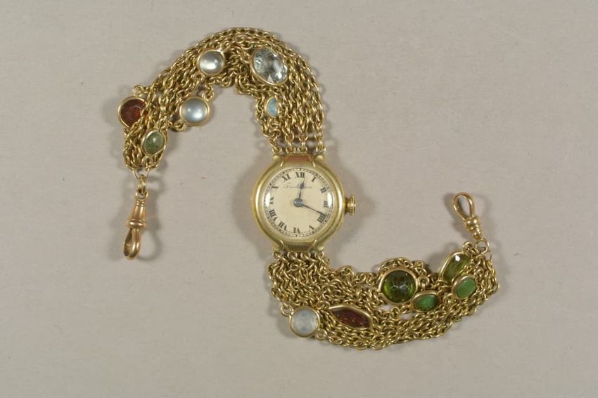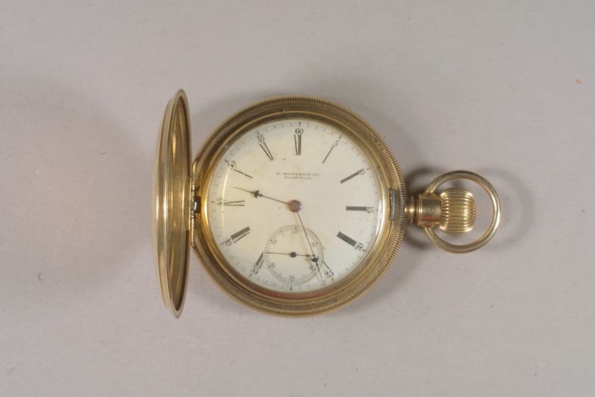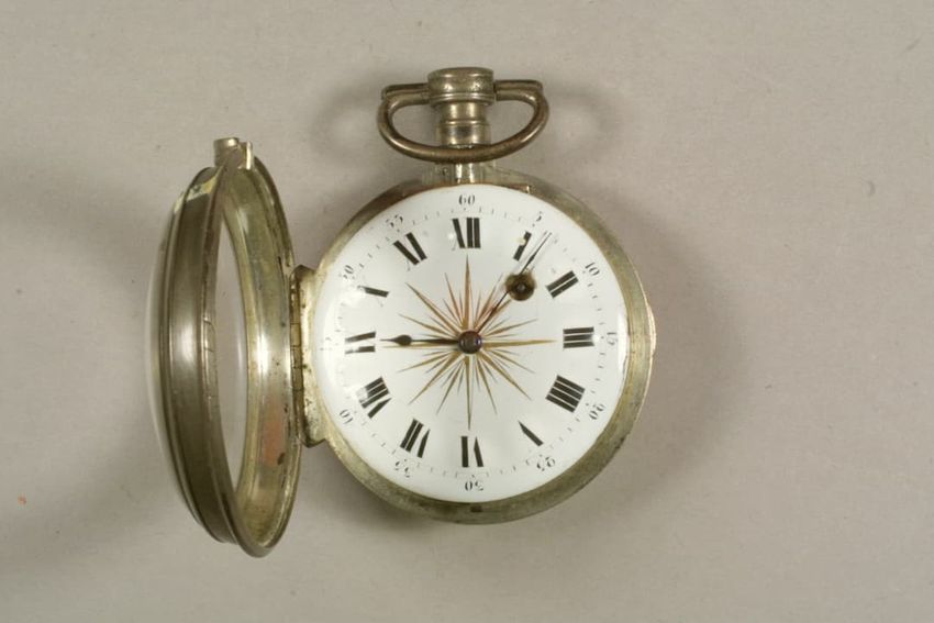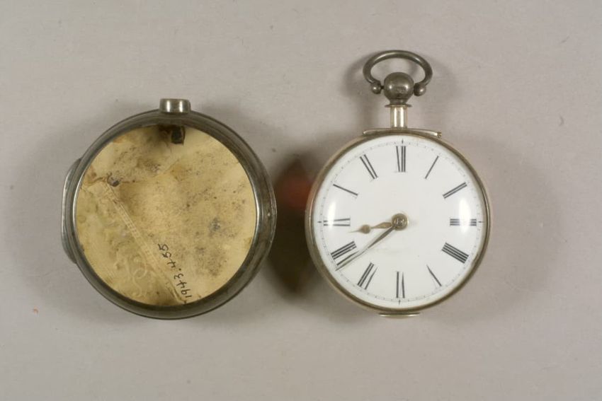 Watch with silver case and two leather straps, one attached and one unattached. The outer case has 9 labels of Phineas Rice, watchmaker, each with a date showing when the watch was cleaned. Outer watch face is a small circle under glass and is opened to a larger white watch face with two sets of Rom...