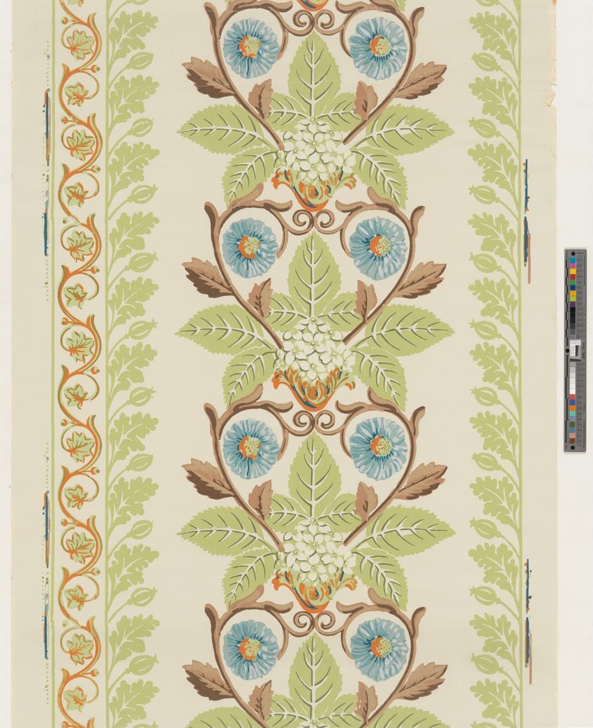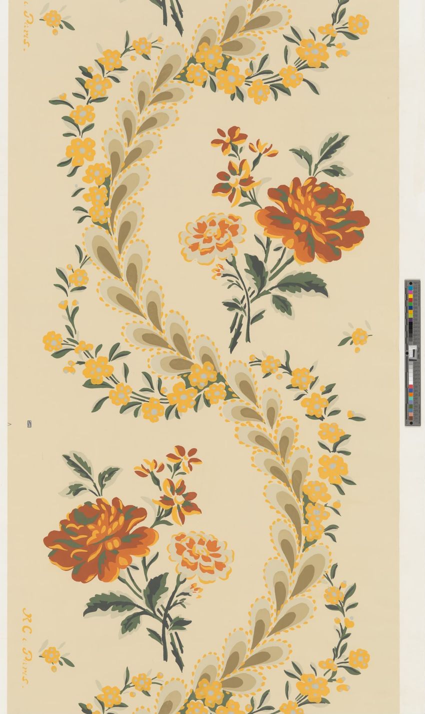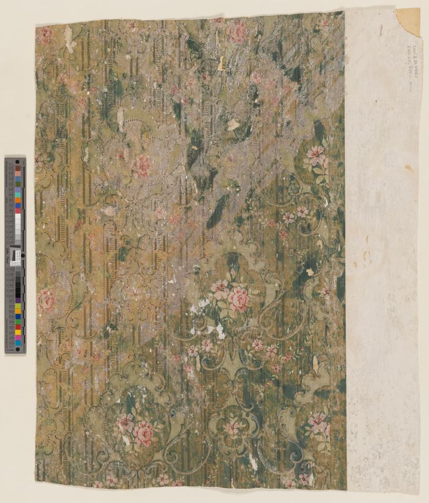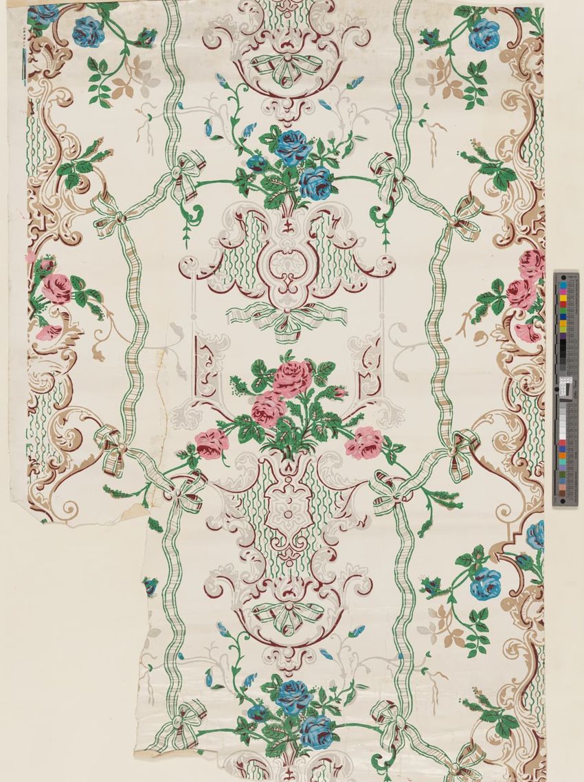Unused wallpaper fragment from Middleton, Massachusetts. Naturalistic floral bouquets with scrolling vines and draping ribbon. Block-printed in white, black, yellow, red, gray, blue-green, two blues, three pinks, and four greens on polished white ground.