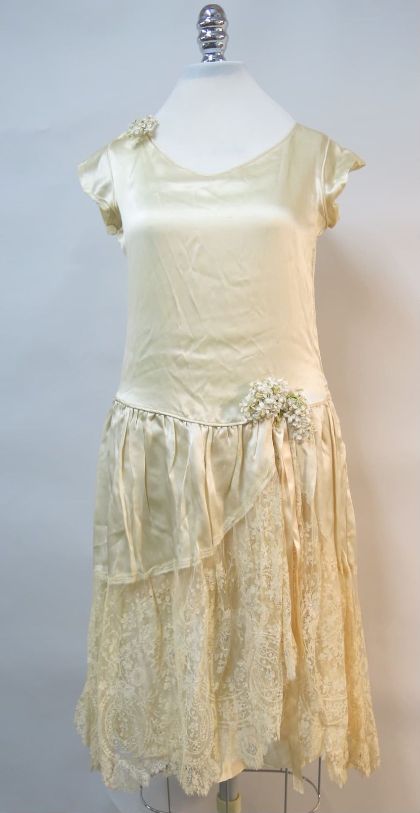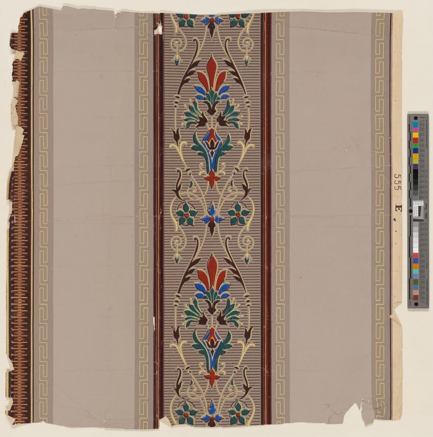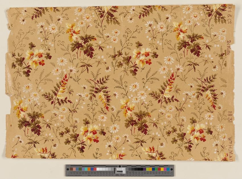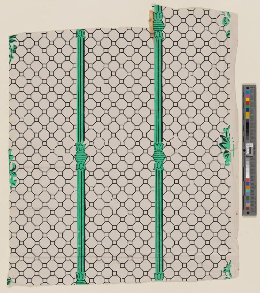 Unused wallpaper fragment from Middleton, Massachusetts. Naturalistic floral bouquets with scrolling vines and draping ribbon. Block-printed in white, black, yellow, red, gray, blue-green, two blues, three pinks, and four greens on polished white ground.