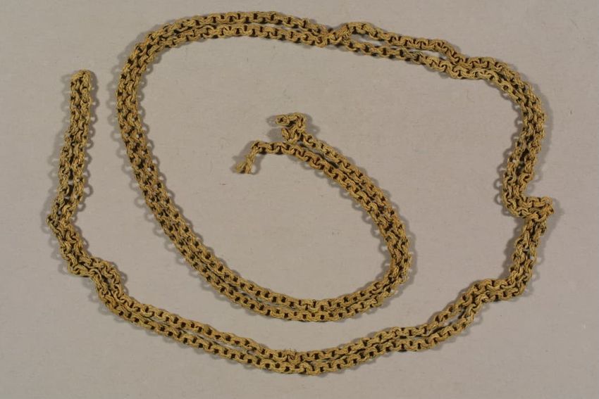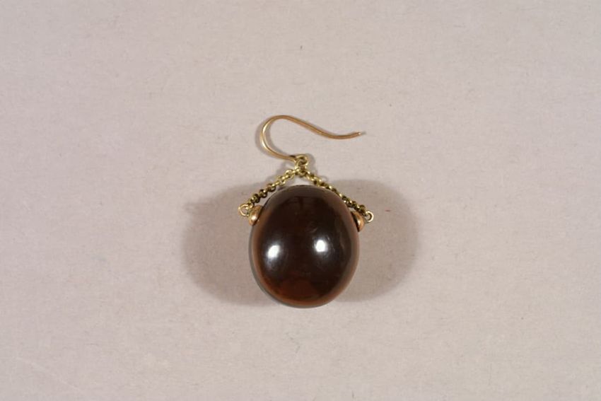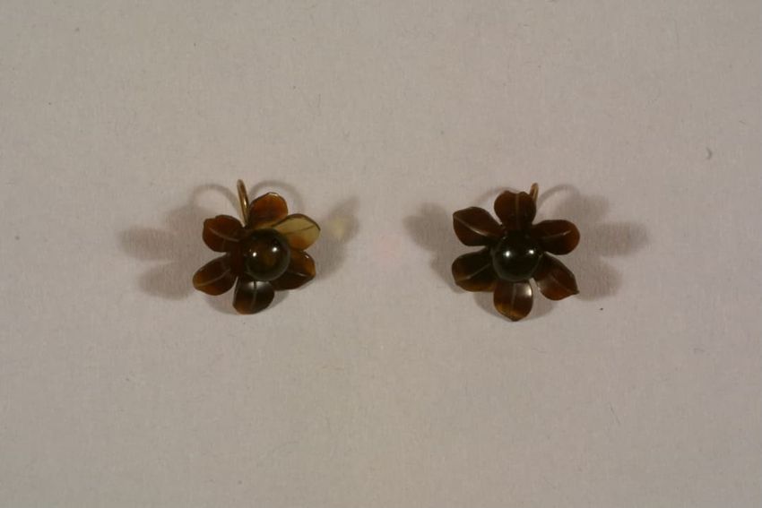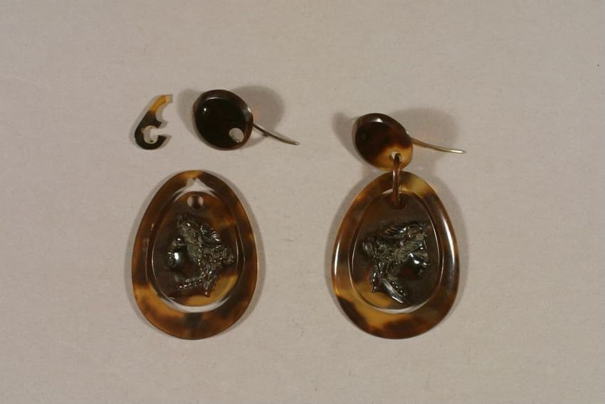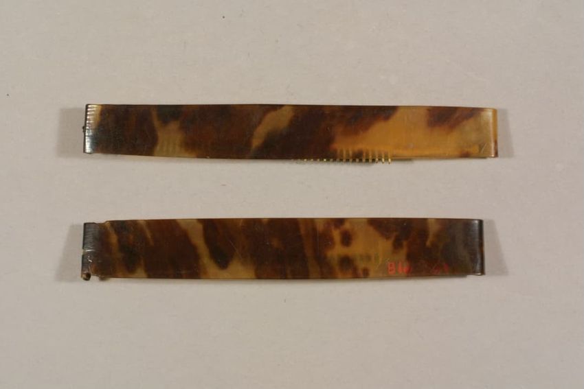 This brooch is part of a set with earrings 1969.2395.2AB. The brooch is constructed in the shape of an open, pleated fan. The surface of the fan is decorated with images of two flying geese, a bird, and a frog, surrounded by engraved foliage. The back of the fan has a glass-covered reserve for hair.