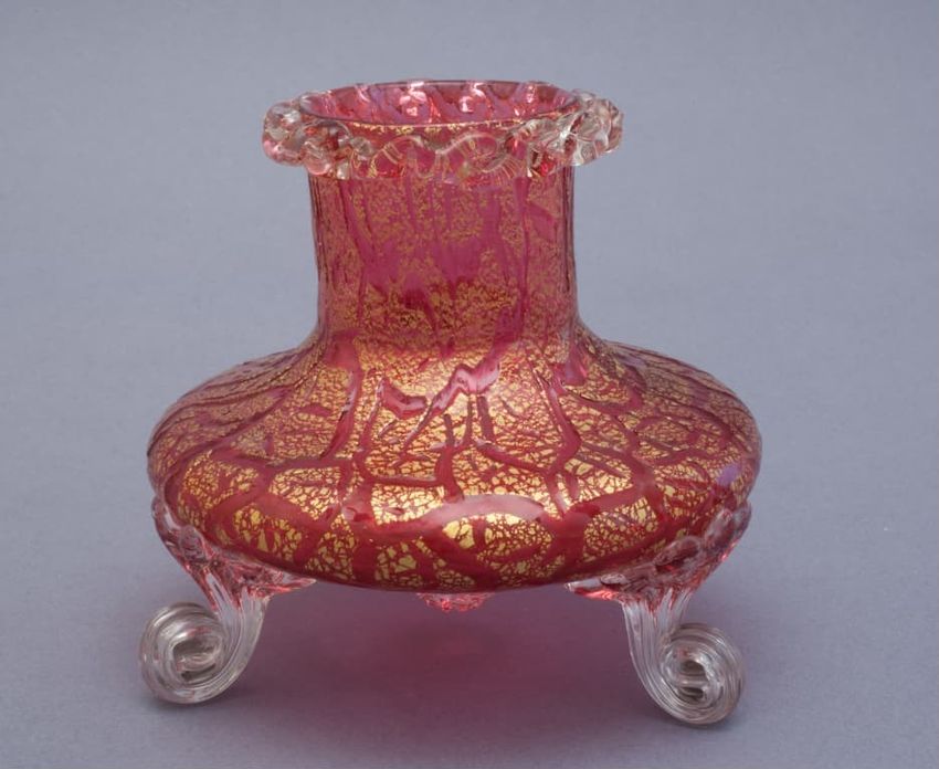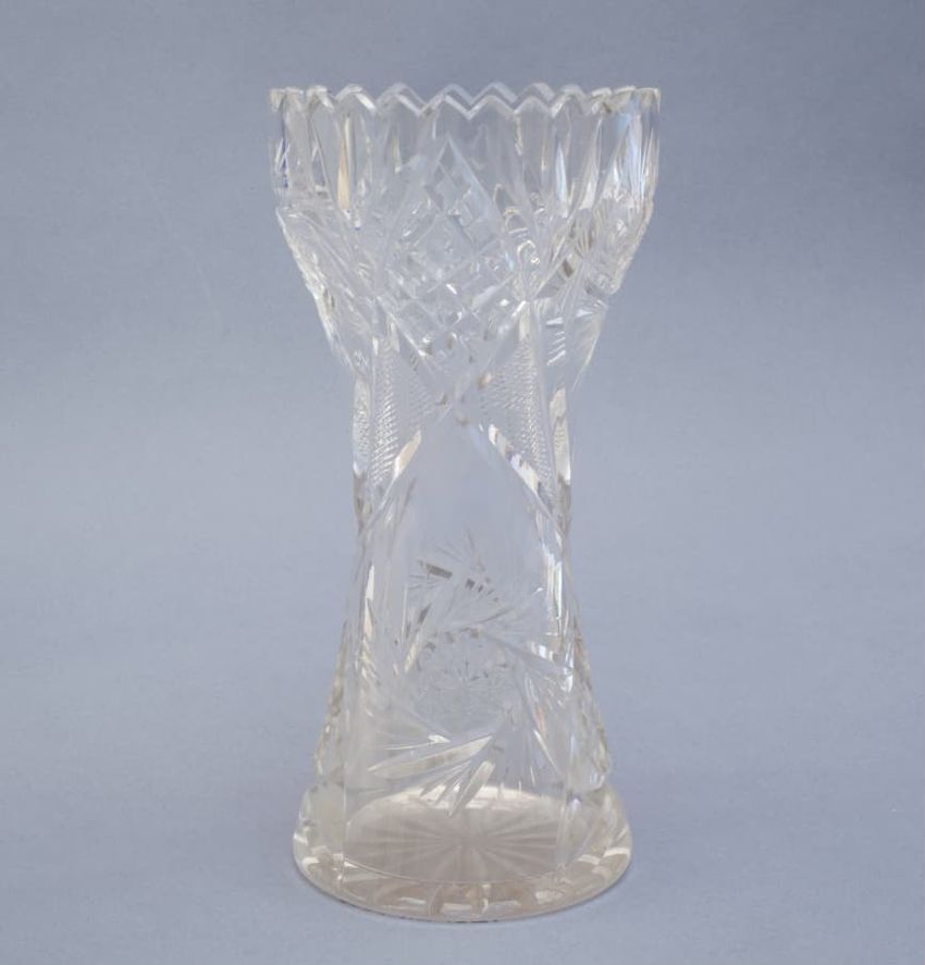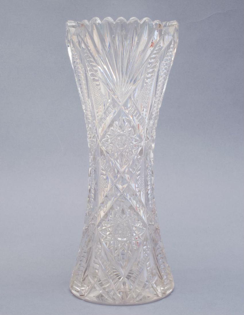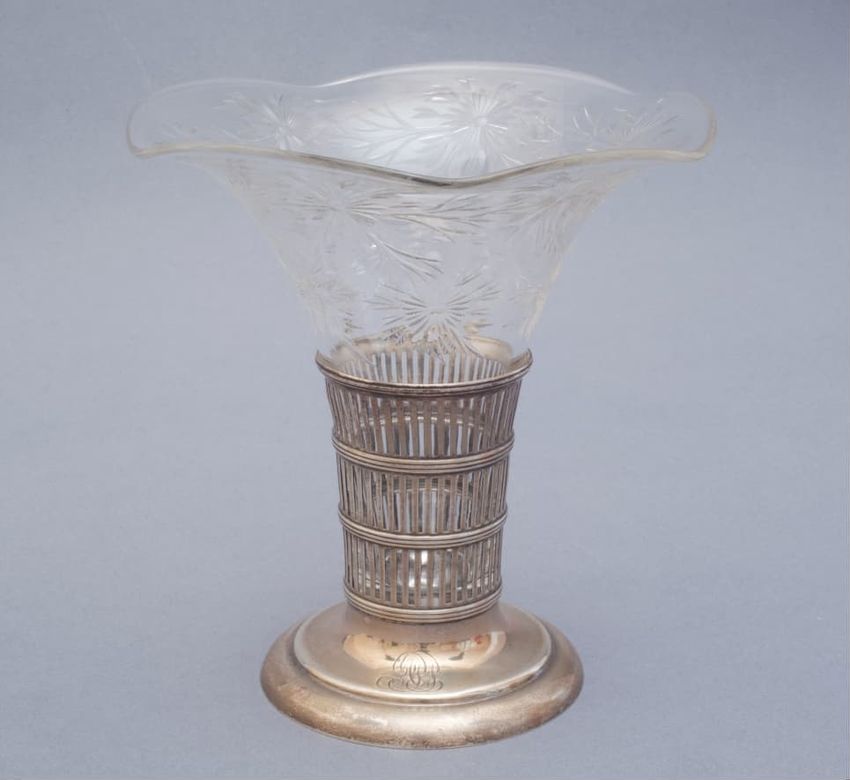 Round crystal decanter with narrow straight neck, applied handle and hinged sterling silver lid with shell decoration. Cut diamond and fan pattern on body, gadrooms around base of neck, and cut star on base.