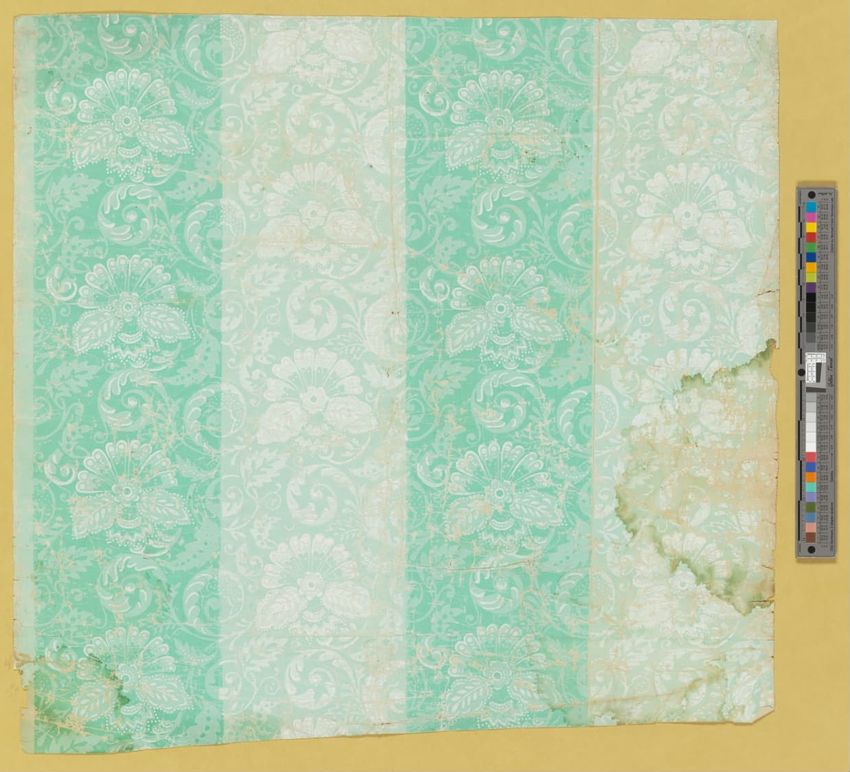 Anglo-Japanese border, aesthetic style, with cherry blossoms; fret work, exotic flowers, and asymmetrical lattice. Printed in light blue, three pinks, grey, ochre, cream, and silver.