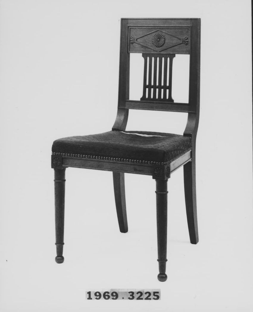 Square back; curved paneled crest rail, central flower; peirced splat; cylindrical front legs