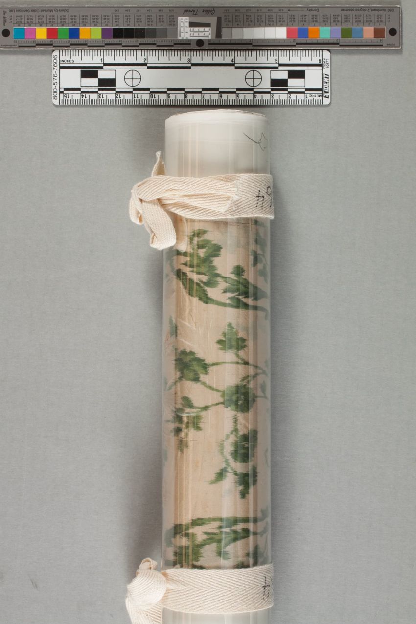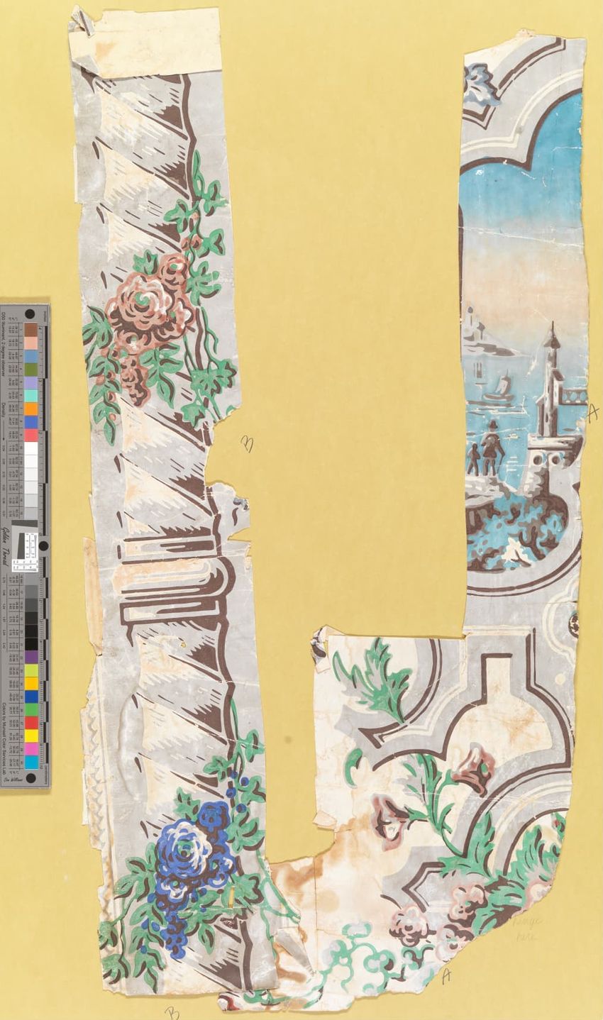 Wallpaper (A) and border (B) fragments from the hall of the Lakeman Johnson House, circa 1840. Wallpaper (A) is a landscape scenary paper with harbor scene and irise sky framed by Gothic cartouches entwined with red roses and blue morning glories, printed on white polished ground. Straight repeat. ...
