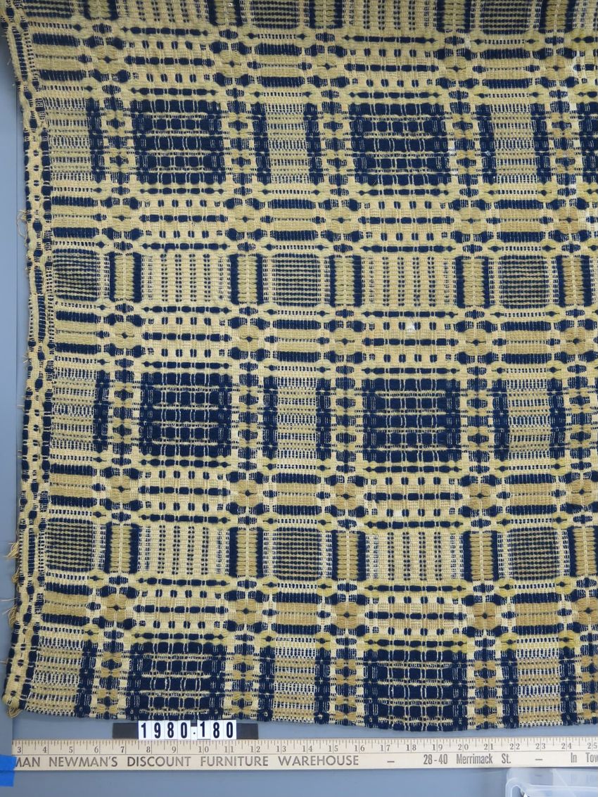 Blue, gold and tan wool with natural cotton; reversible; overall geometric gridwork pattern of bars and small blocks. All edges hemmed; sides and bottom with fringe.