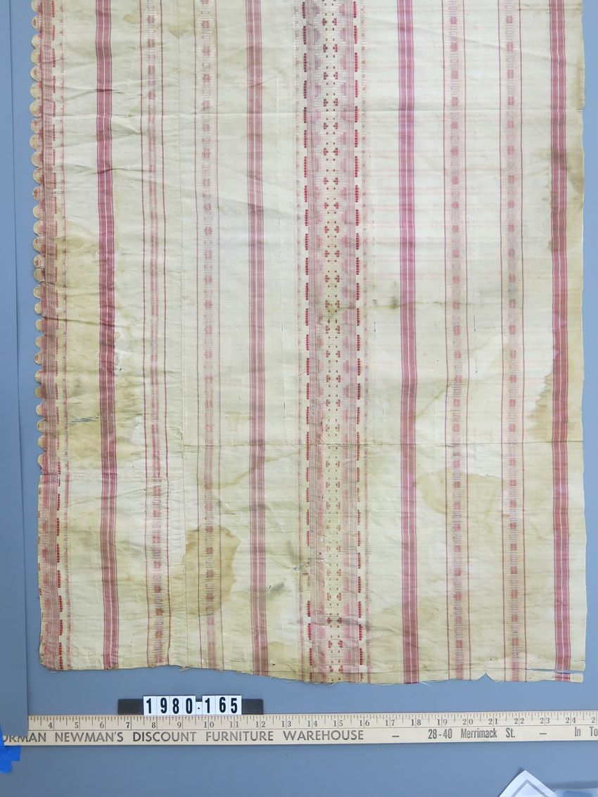 L-shaped, selvage to selvage; cut-out glazed polychromatic printed cotton; repeating columns, daisy-like flowers; thorn-like lattice. Birds perched on lattice. Heavily glazed; tightly and fine woven cotton.