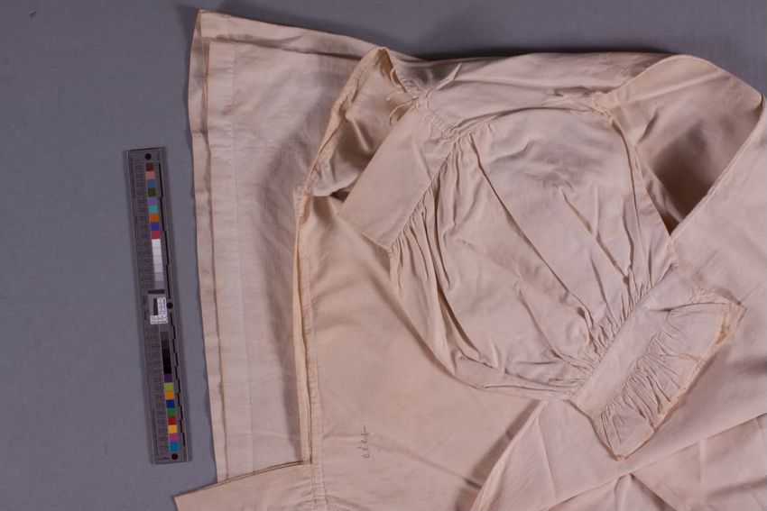 White linen; plain; square neckline with drawstring at left; short, puffed sleeve with ruffled cuff.