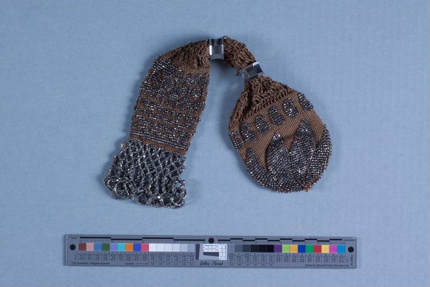 Brown knit purse with silver-colored beading, rings, and tassels on one end.