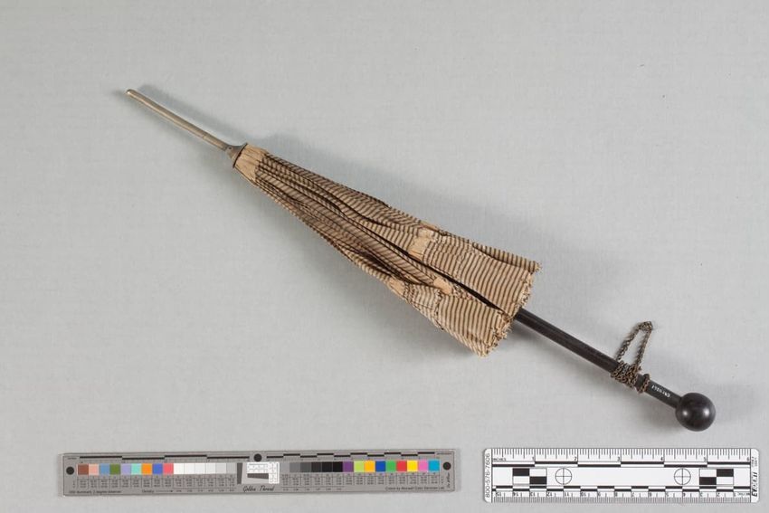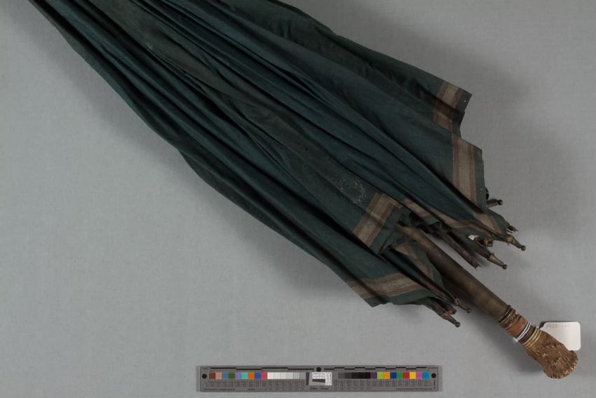 Green cotton cover with white and red stripe woven at bottom; wood shaft and ribs; pointed brass ferrule and rib tips; long brass slider with engraved rings; carved bone, brass and wood handle; brass ring closure on coton tie.