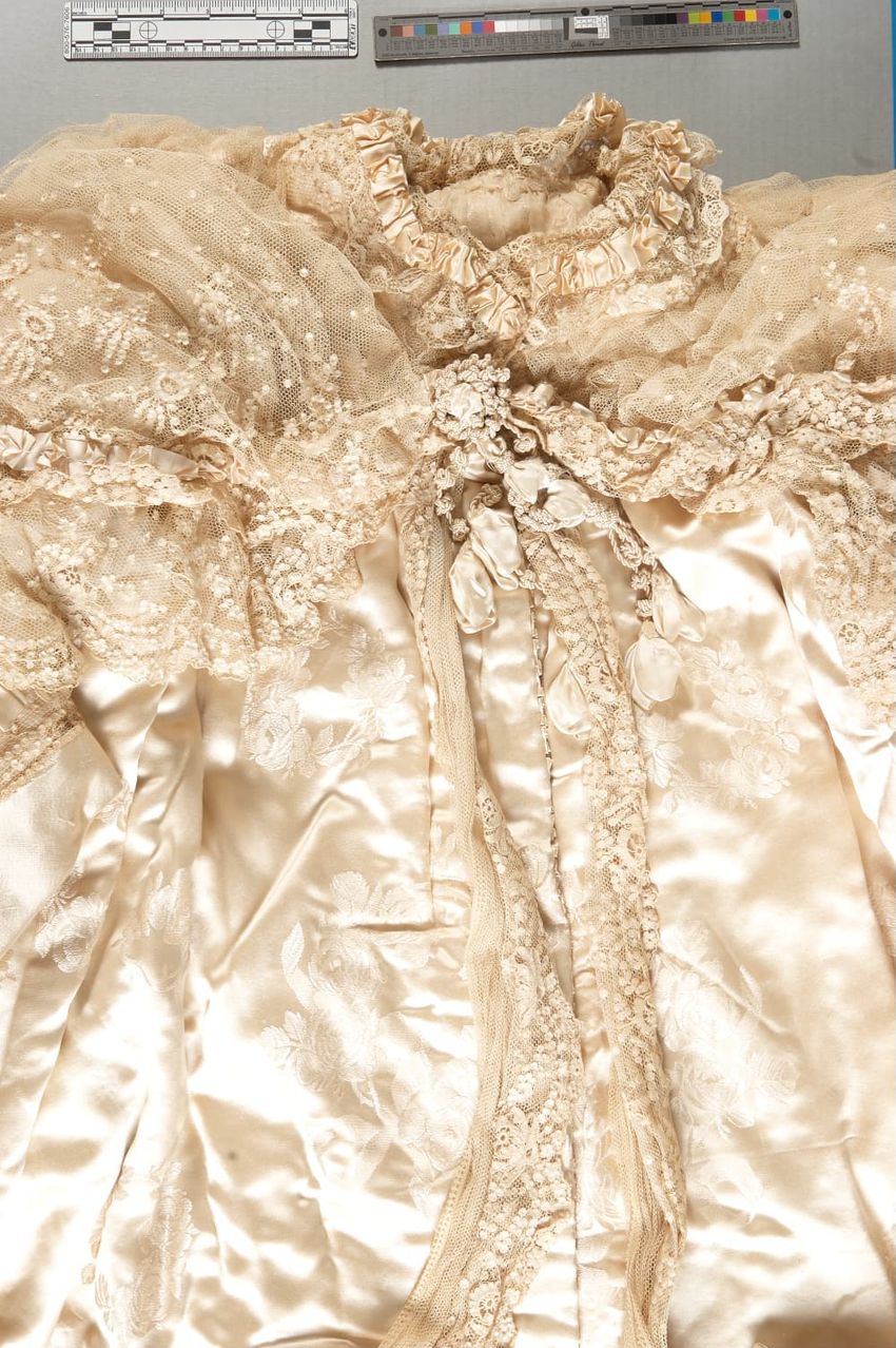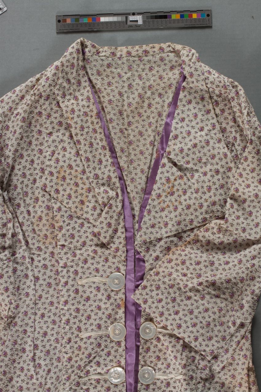 Cream net; printed with blue polka dots; printed with border of large rose/floral garland in pink, tan, green on blue picotage ground; high boned collar, hook and eye at collar back; collar has pleated ruffle and printed scalloped border (purple flowers and green leaves), chemisette collar has tucks...