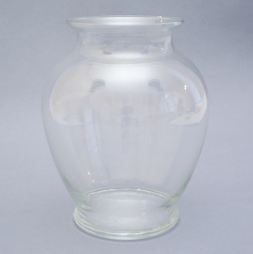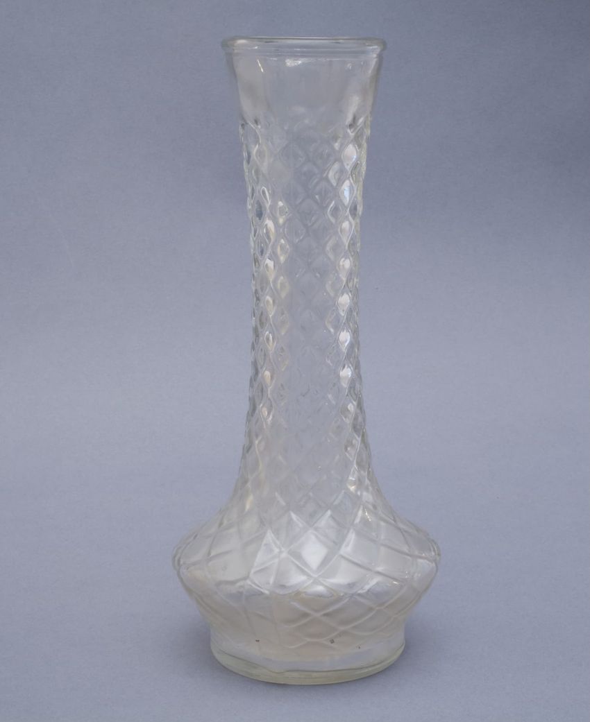 Clear molded glass vase with lattice pattern. Narrow neck with wide bottom.
