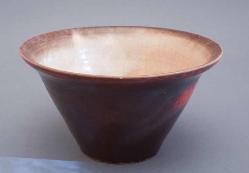 Ceramic vase with sloped sides and flared rim. Dark red and purple exterior glaze. Nannie Borden Phillips butterfly mark on bottom.