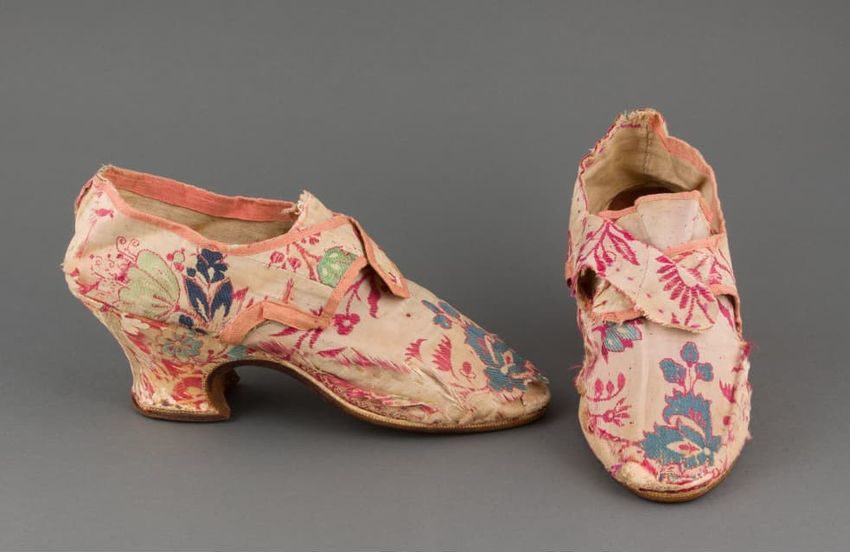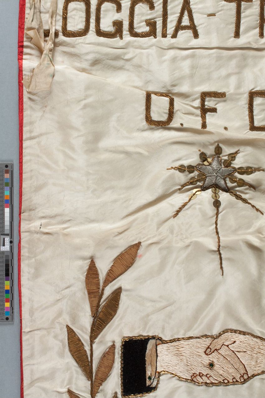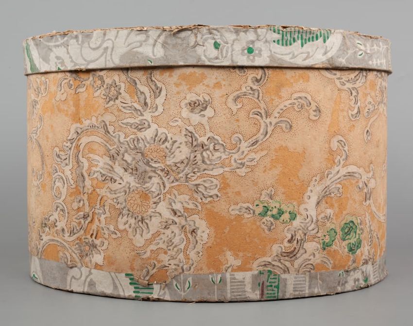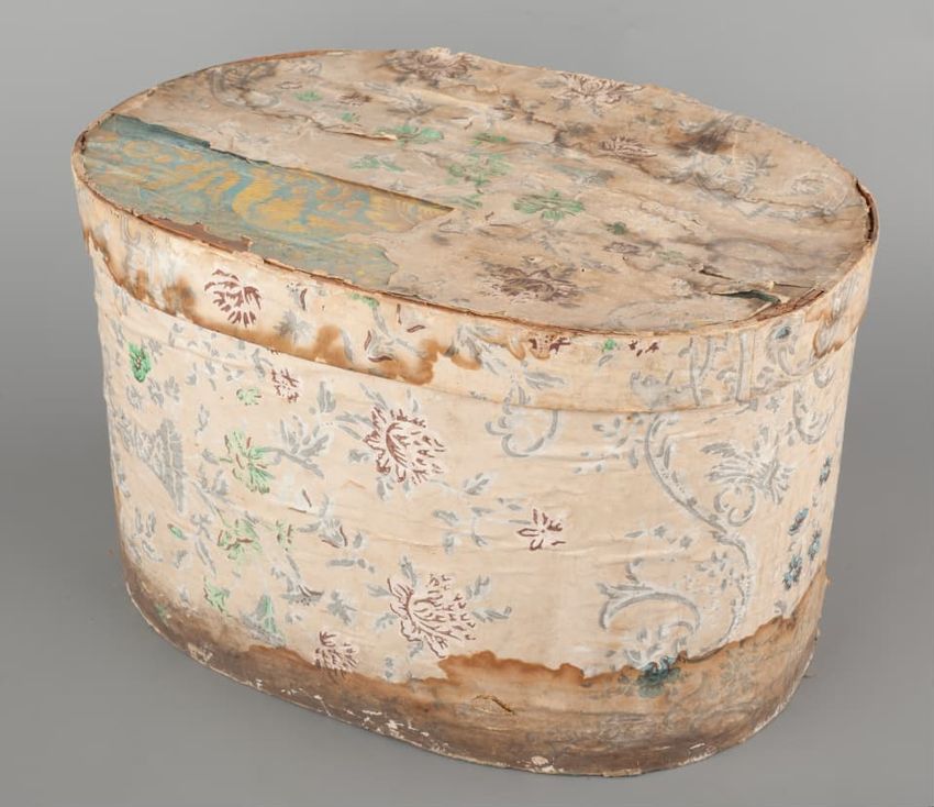 Oval wooden bandbox (A) and lid (B) covered with two layers of wallpaper. Bottom layers is a block printed damask flroal pattern in yellow and ochre on a blue ground. Top layer is a floral pattern with vases and scrolls, block pritned in red, pink, green, two grays, and bllue on a white polished gro...