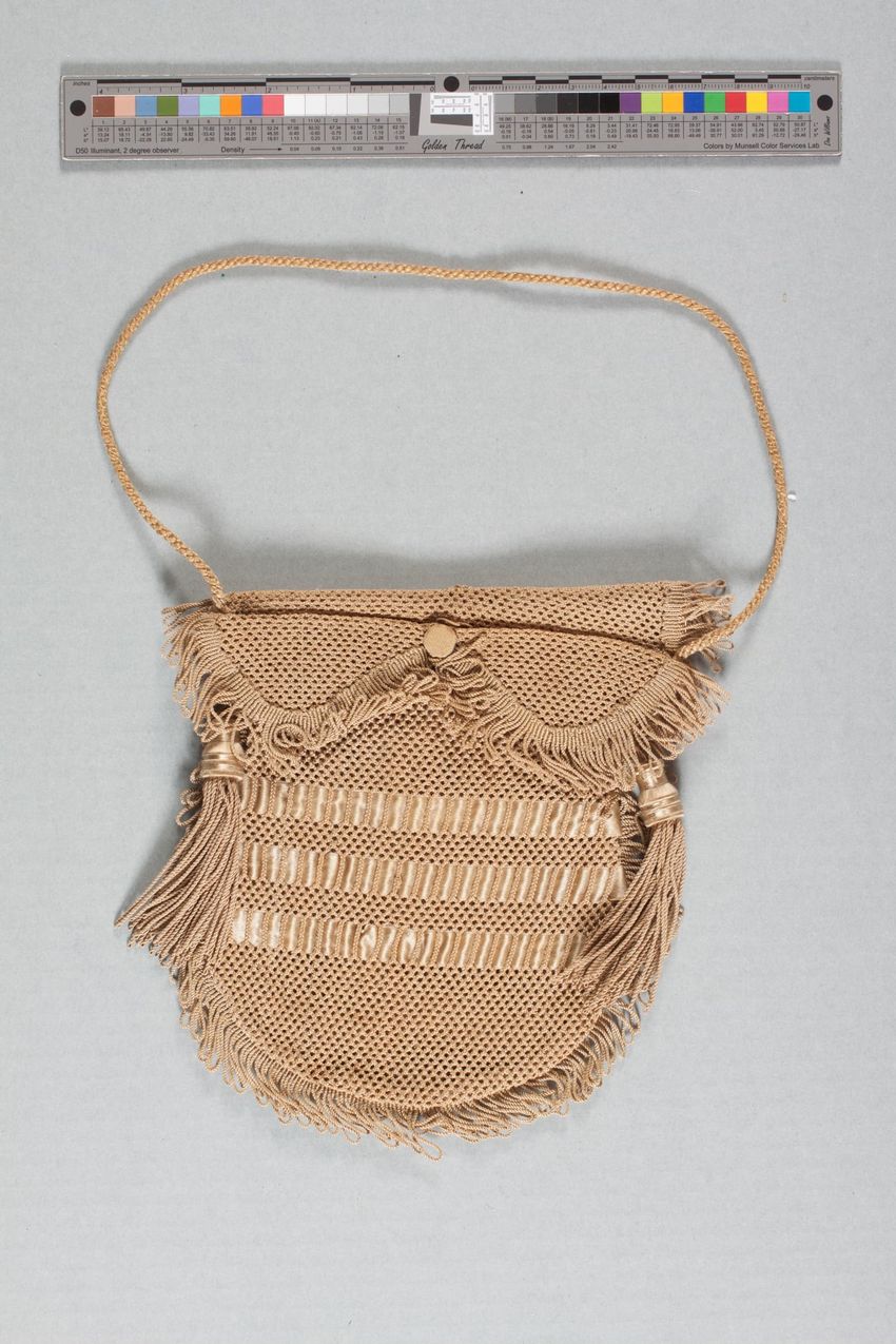 Flamestitch - bargello in blues, greens, reds - exterior; yellows, purples - interior; opens side by side with four pockets; green wool lining trimmed with green tape at edges. Tied closed with red and black silk tape.