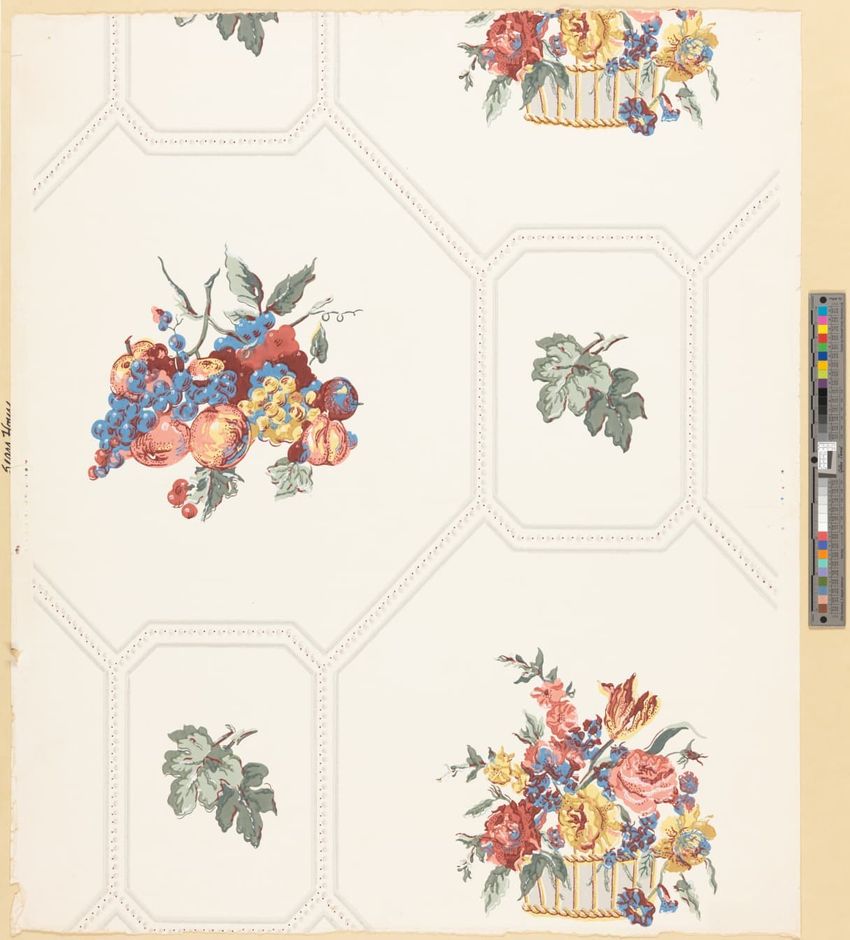 Porcelain enameled soup plate. On gold ground, green tendrils and pink tree peonies; central medallion, bordered in gold, depicts a bird and pink peonies; four scrolled medallions with butterflies around them depict 1) four figures seated and standing around table and 2) scenic view of river, boats,...