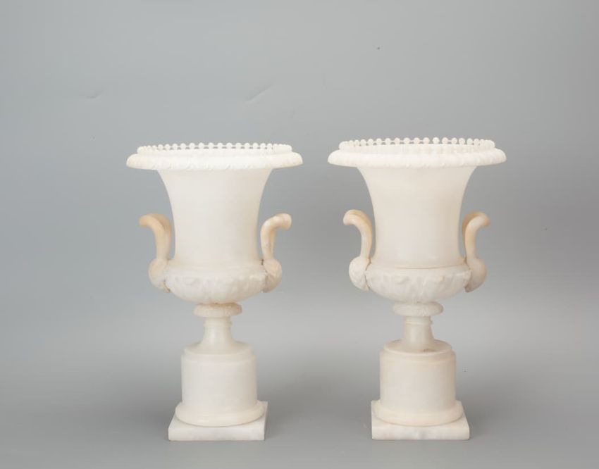 One of a pair of alabaster vases. White urn on punch; egg and dart and string beaded lip; shaped handles.
