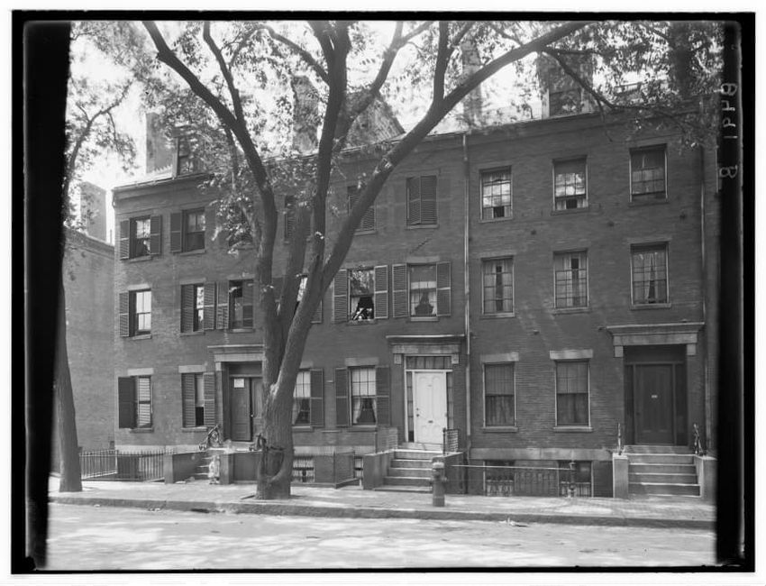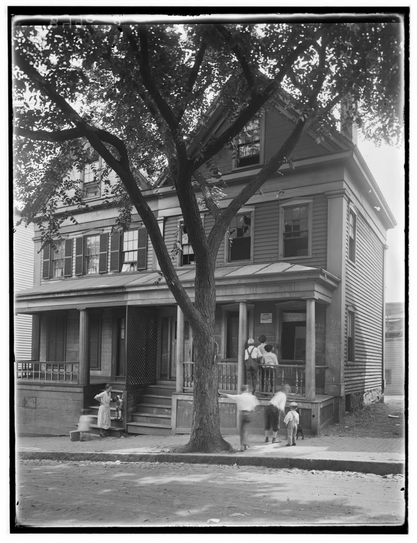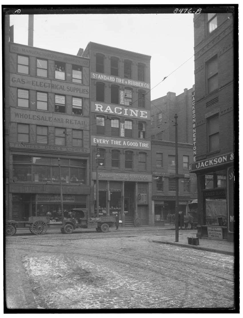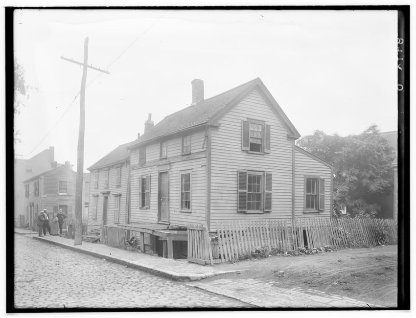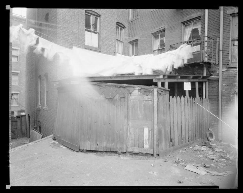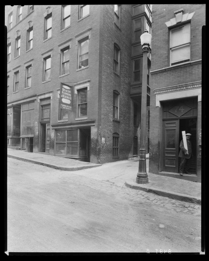 The image depicts Dock Square in Boston, Massachusetts. Visible are multiple buildings with various signs, including "S.J. Sands Plumber and Gas Fitter," "L. Trastram Sheet Metal," "Quick Lunch," and "Tea Coffees." Horse-drawn carriages are visible on the streets and pedestrians are walking on the s...