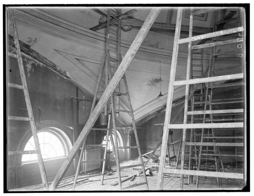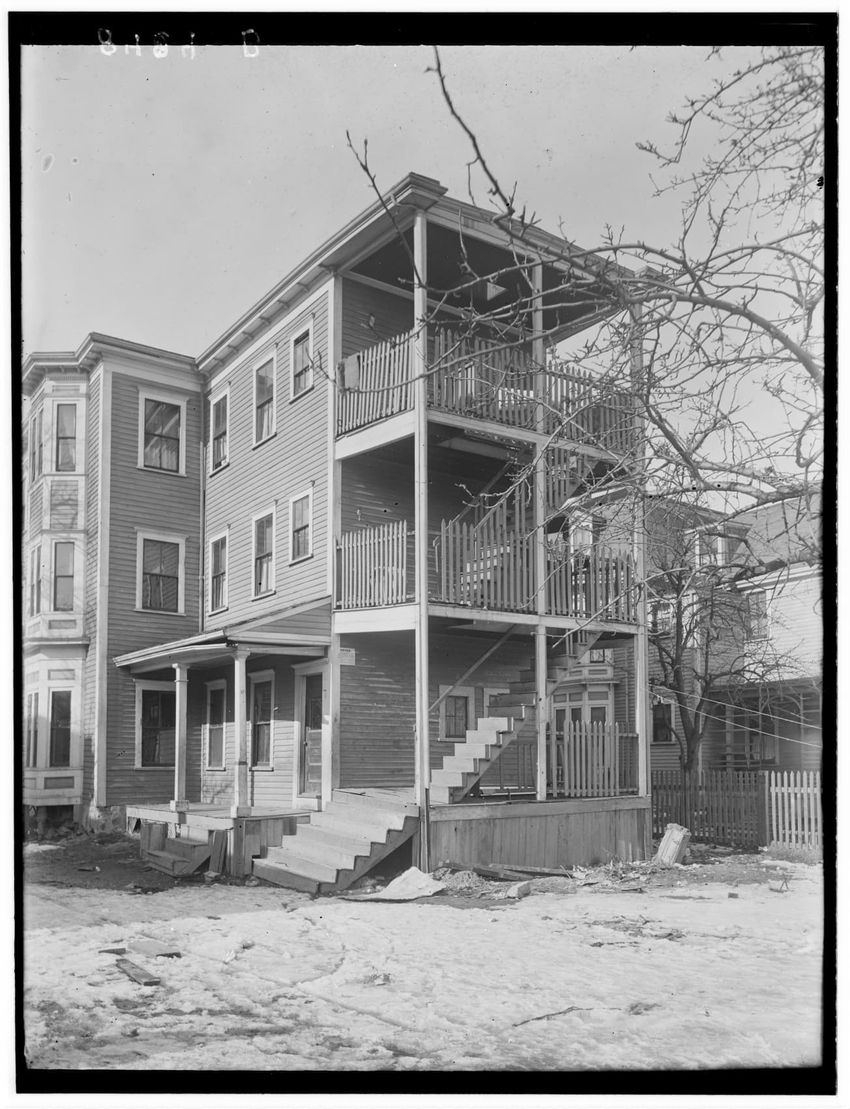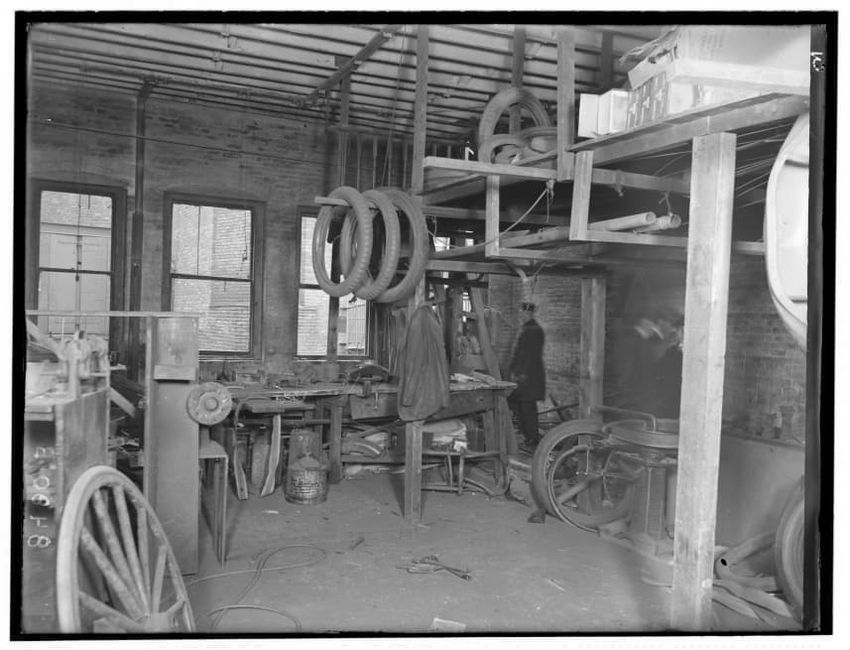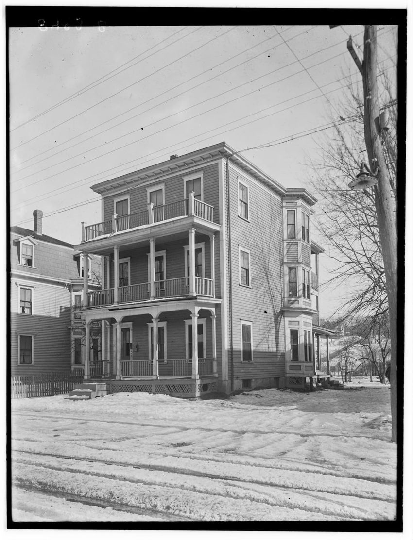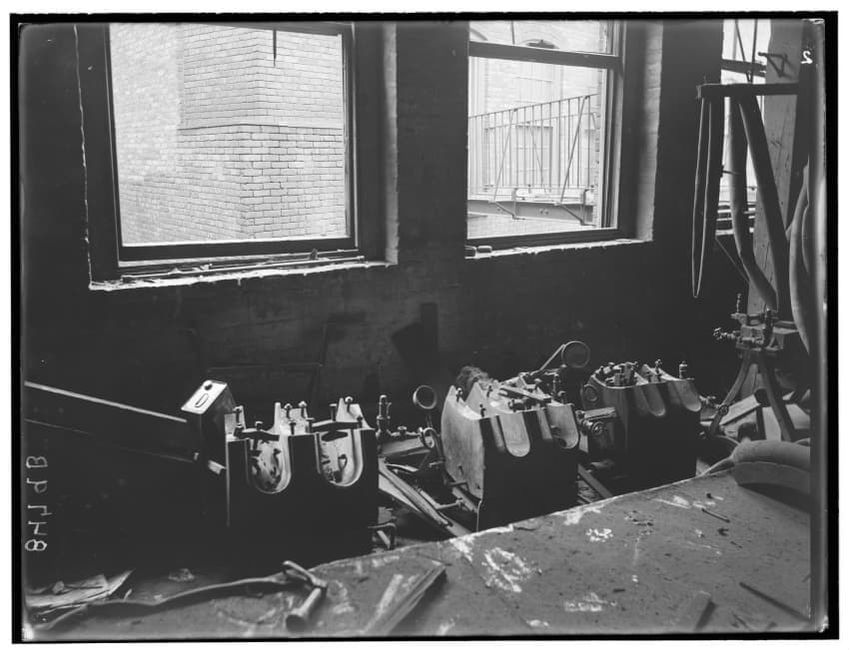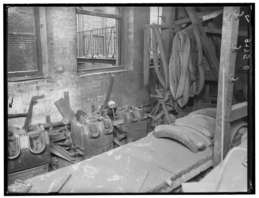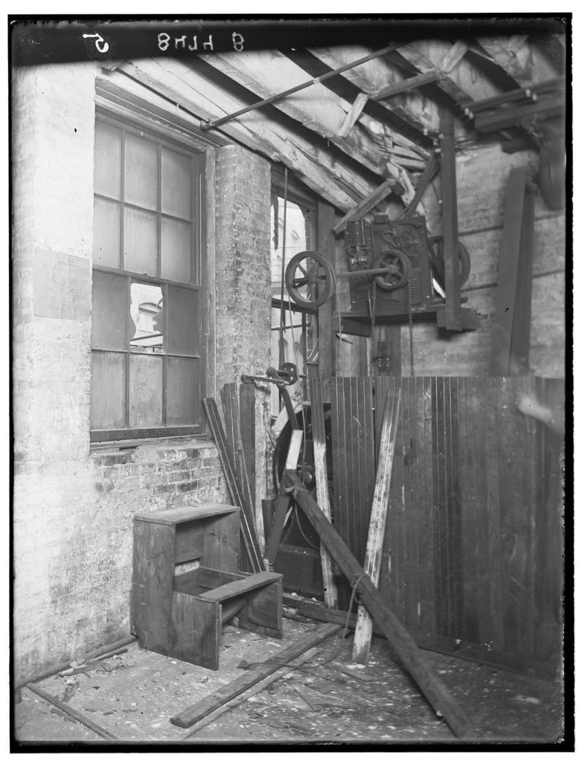 The image depicts Dock Square in Boston, Massachusetts. Visible are multiple buildings with various signs, including "S.J. Sands Plumber and Gas Fitter," "L. Trastram Sheet Metal," "Quick Lunch," and "Tea Coffees." Horse-drawn carriages are visible on the streets and pedestrians are walking on the s...