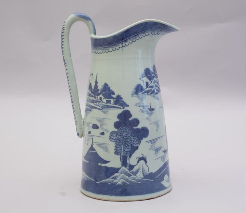 Tall cylindrical blue and white porcelain pitcher with loop handle. Slighty tapered sides with curved spout. Painted scenes of Chinese pagodas, boats on a river, mountains, bridge, and trees. Line and cloud border decoration. Fern and flower decoration on back of handle.