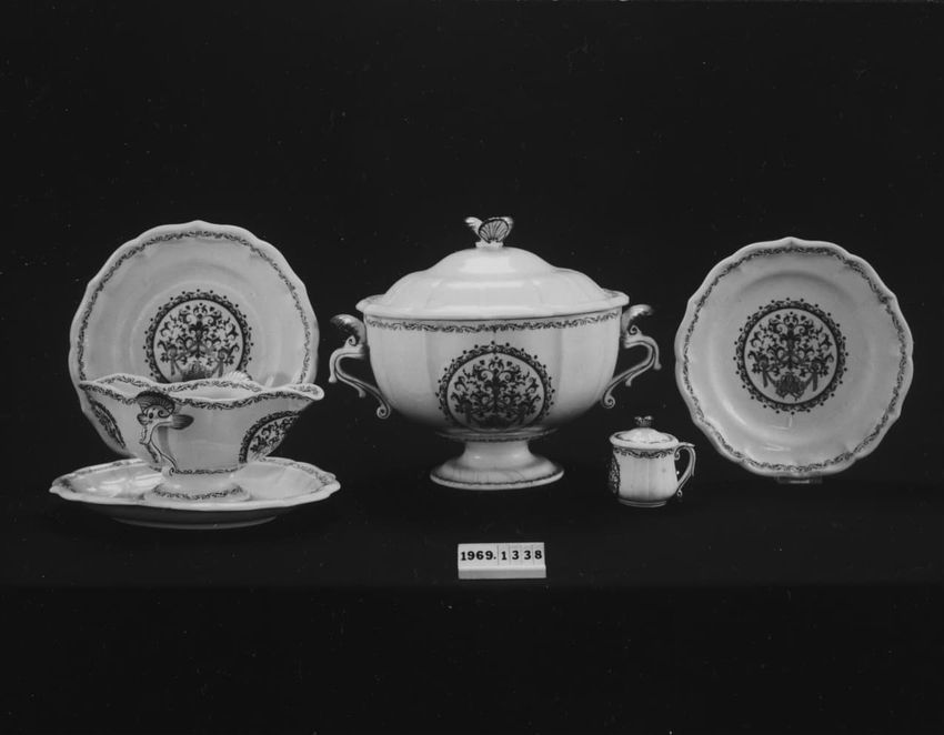 Blue, white; circular , fluted, shallow well; stylized acanthus in rondel