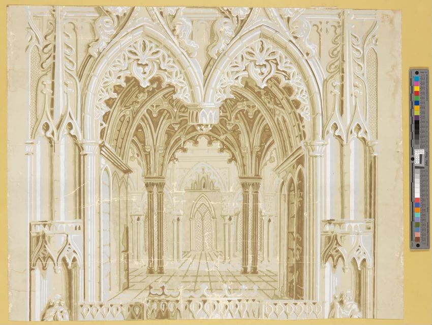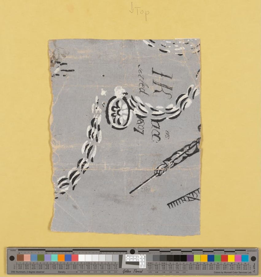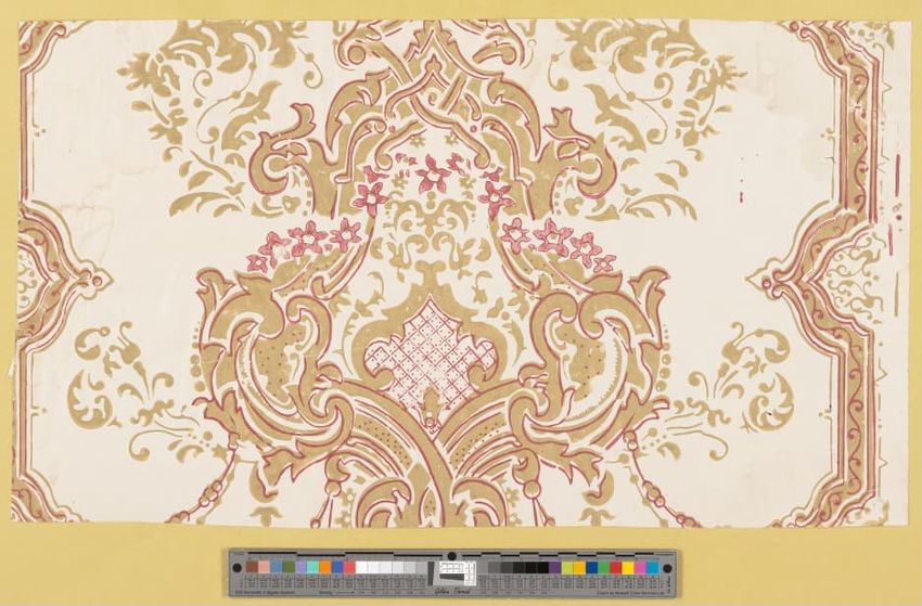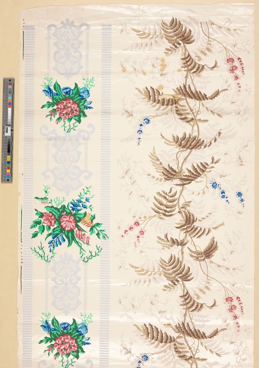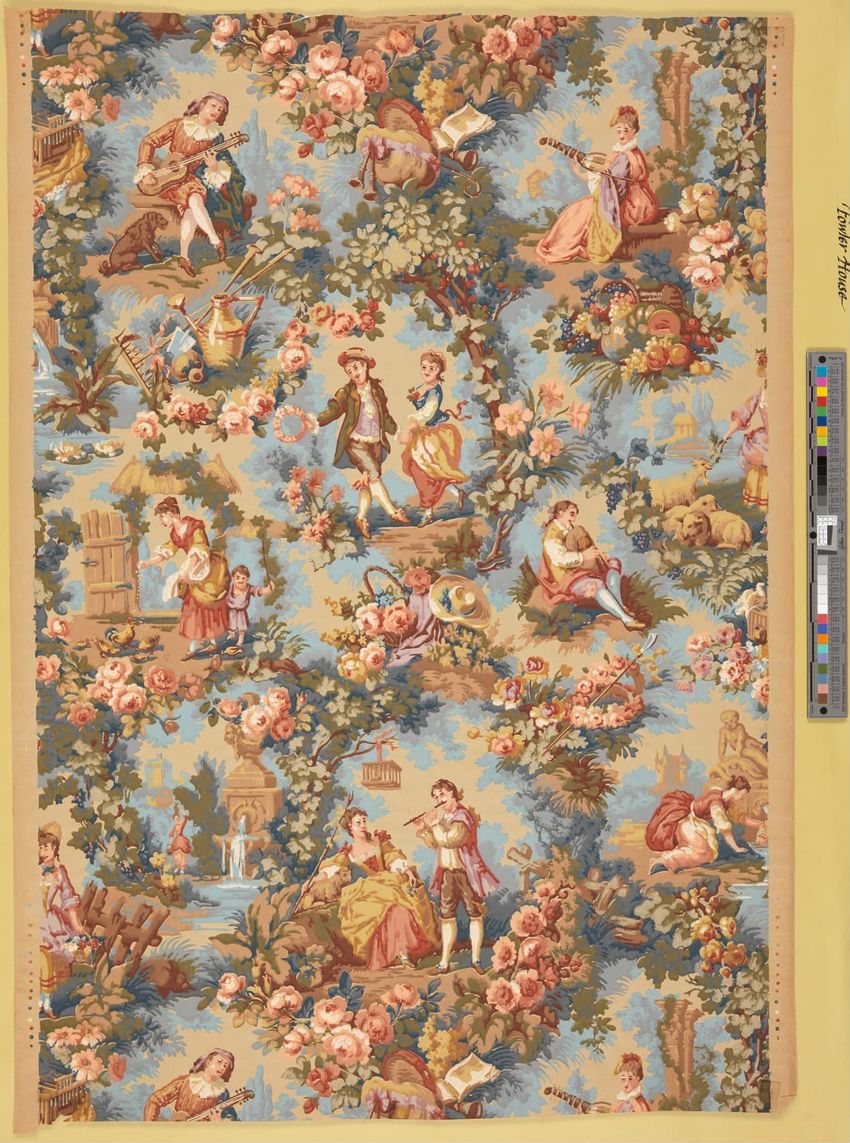 Unused wallpaper fragment. Fragonnard-like pastoral vignettes separated by flowers, fruit, gardening tools and musical instruments. Printed in three blues, pink, rose, mauve, red, lavender, olive, tan and brown on unground paper.