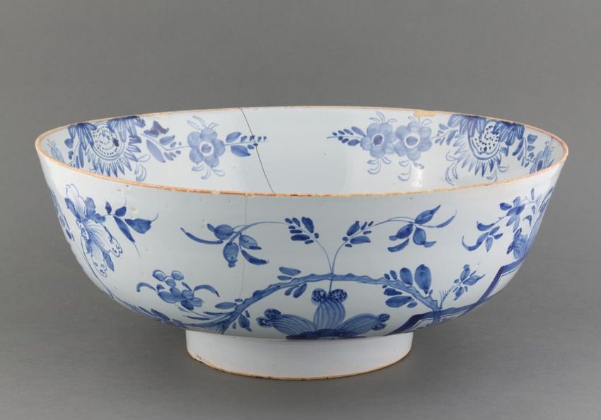 Large blue hand-painted Delft bowl. Underglaze floral decoration around outside of body and inside rim. Bottom of bowl with underglaze blue decoration of bird amongst floral branches. Footed base.