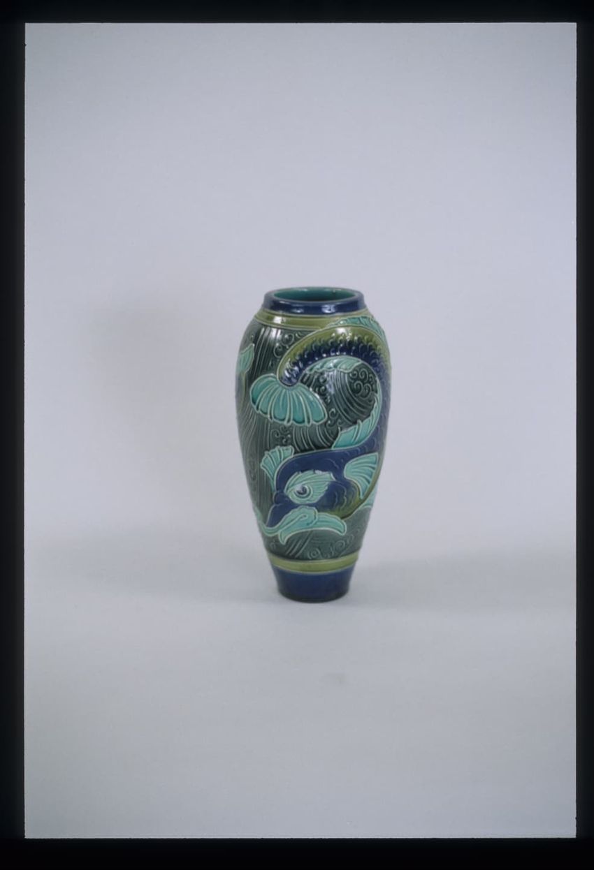 Earthenware vase with a glazed cylindrical body and rounded shoulders that tapers to the base and a short neck. Vase has molded decoration of two large fish and one small fish in cobalt blue, green, and teal on ground of scrolled waves in bluish green that is bounded by cobalt blue and green bands ...