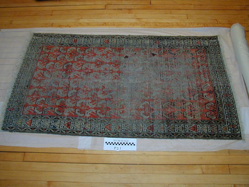 Rug with center panel of eighteen rows of bent leaves, ivory on salmon ground. Two narrow borders of ribbon and dot design in salmon and olive green. Wide border of multi colored latched trianges on ivory ground. Edges bound in olive green. Cardboad tag identifies rug as "Hamadan."
