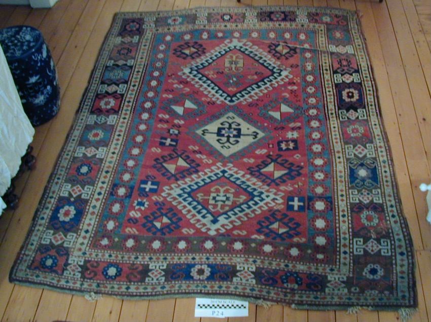 Rug with center panel of twelve rows of multi colored latched diamonds on dark blue ground. Multiple borders: multi colored eight pointed stars on faded red ground; serrated leaf and wine glass border on ivory ground; multi colored eight pointed stars on blue ground. Edges bound in dark brown. Cardb...