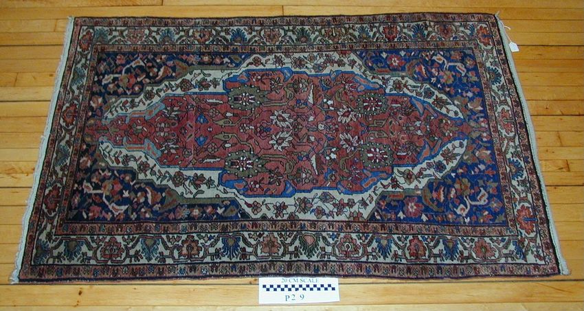Rug with oval center medallion filled with flowering vines, pink, white, and blue on dark blue ground. Field around medallion is also filled with flowering vines. Two narrow borders of red and pink flowering vines on pink ground. One wide border of pink and blue palmettes on ivory ground. Edges are ...