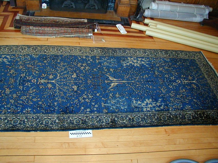 Rug with center panel of ascending tree and peacock design in ivory and pale blue on deep blue ground. Intricate floral and palmette border on ivory ground. Edges are bound in blue. Appraisal identification as "Sharistan corridor rug".