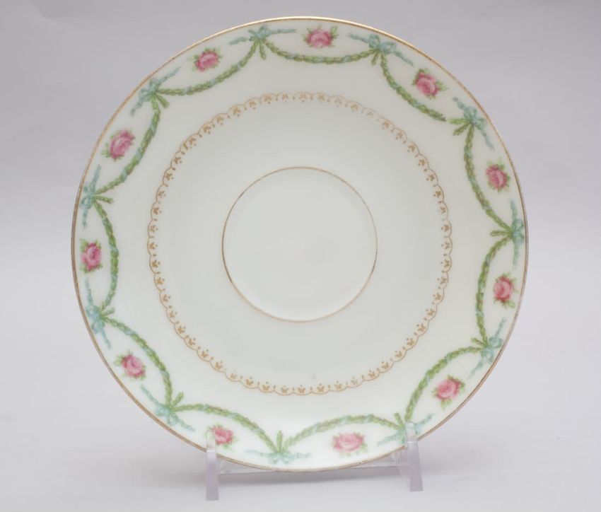Porcelain saucer. Decoration around edge is a swag of greenery held up by blue ribbons. Above each curve of the swag is a pink rosebud. Also decorated with gilt designs.
